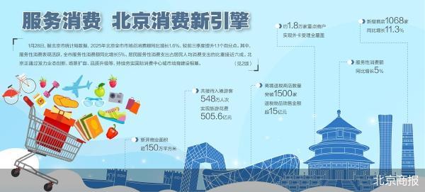 1月28日,北京市统计局发布数据,2025年北京市市场总消费额同比增长1.6%,较前三季度提升1.1个百分点。其中,服务性消费表现活跃,全市服务性消费 额同比增长5%,居民服务性消费支出占居民人均消费支出的比重接近六成。北京正通过业态创新、场景扩容、品质升级等发力,持续夯实国际消费中心城 市培育建设根基。 服务消费成核心引擎 北京消费市场凸显服务消费的主导地位与强劲动能。根据北京市统计局数据,2025年北京市服务性消费额同比增长5%。线上线下不断融合,新型消费加快 发展,全市限额以上批发和零售业、住宿和餐饮业企业触网率达51.9%,同比提升2.4个百分点,实现网上零售额5815.3亿元,占社零总额的比重为42.5%, 同比提升1.4个百分点。随着线上线下加快融合,即时零售消费模式愈加活跃,限额以上便利店、超市和仓储会员店等业态通过公共网络合计实现的零售额 规模持续扩大,同比增长近两成。 夜经济也构建起全域联动的消费版图。根据北京市商务局提供的数据,截至2025年,全市夜经济消费点位从2019年的22个增至139个,涵盖25个地标、84个 打卡地与30个生活圈。夜经济业态创新不断突破,沉浸式消费场景成为核心亮点 ...