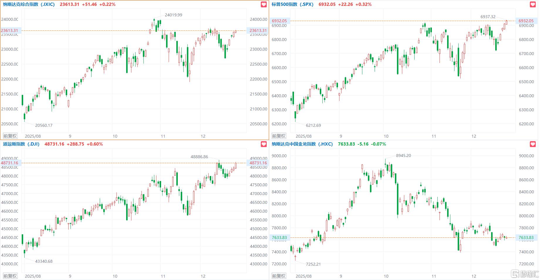 | 道琼斯 | 纳斯达克 | 标普500 | | --- | --- | --- | | 48710.97 | 23593.10 | 6929.94 | | -20.19 -0.04% | -20.21 -0.09% | -2.11 -0.03% | | 中国金龙指数 | 纳指100期货 | 标普500期货 | | 7688.53 | 25856.00 | 6977.00 | | +54.70 +0.72% | -24.50 -0.09% | -5.50 -0.08% | 记者丨黎雨桐 编辑丨金珊 周五(12月26日),美国三大股指小幅收跌,道指跌0.04%报48710.97点,标普500指数跌0.03%报6929.94点,纳指跌0.09%报23593.1点。 | NYMEX WTI原 | ICE布油 | ICE轻质低硫原 | | --- | --- | --- | | 56.93 | 60.37 | 56.70 | | -1.42 -2.43% -1.43 -2.31% -1.43 -2.46% | | | 加密货币多数上涨,比特币重回87000美元上方。过去24小时超8万人爆仓。 | B | BTC $5 ...
