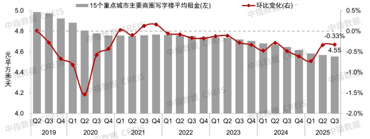 中指研究院:三季度全国重点城市主要商圈写字楼平均租金为4.55元/平方米/天 环比下跌0.33%