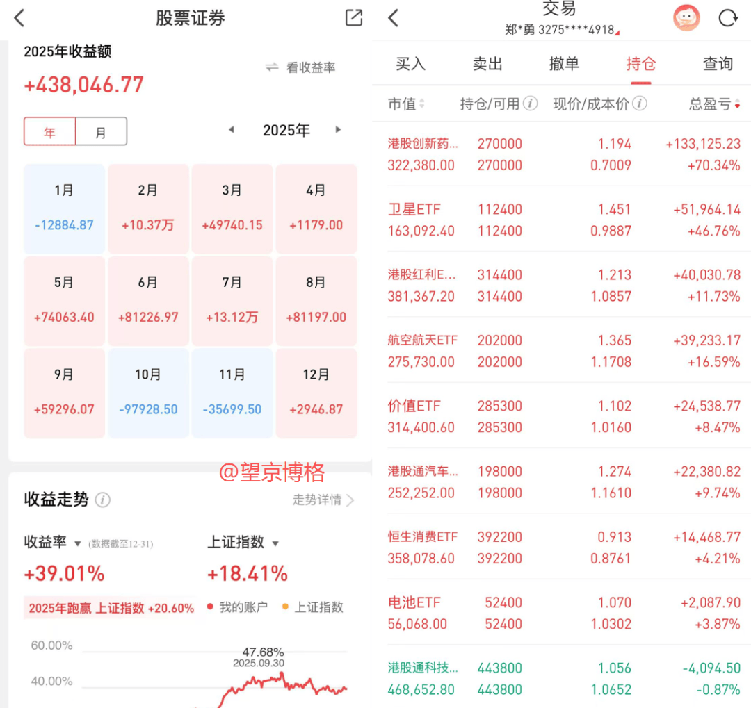 2025年投资业绩总结 - 截至2025年末,合计持仓资产超过1000万元,全年合计盈利184.3万元,收益率为33.89% [1][13][14] - 场内ETF账户资产260万元,全年盈利43.8万元,收益率39.01%,跑赢上证指数20.60个百分点 [1][4] - 场外基金账户资产540万元,全年盈利132.5万元,收益率33.89% [3][8][12] - 基金投顾账户资产120万元,累计盈利约8万元 [13] - 近十年实盘累计收益率为219.8%,年化收益率为13.02% [16] 场内ETF账户操作与配置 - 该账户以中短期波段操作为主,2025年12个月中有9个月盈利,月度胜率为75% [1][4] - 当前核心配置方向为港股,辅以价值(防守)和航空航天(进攻)板块 [4] - 重仓的港股方向ETF包括:港股创新药ETF、港股通科技ETF、恒生消费ETF、港股红利ETF、港股通汽车ETF [4] - 重仓港股的核心逻辑在于其估值相比A股有明显优势,安全边际更高,且聚集了中国新经济的核心标的 [5] - 近期盈利亮点来自航空航天ETF和卫星ETF,后者自9月底布局以来累计浮盈近50% [7] 场外基金账户操作与配置 - 该账户以长期配置为主,2025年12个月中有8个月盈利,月度胜率超过66% [8][12] - 近期操作包括减仓10万元易方达国防军工,以将整体军工仓位从超配近20%调整至15%左右的合理水平 [9][12] - 目前主要持仓方向为资源、A股科技主动基金、港股的恒生科技与恒生医疗 [12] - 本周盈利主要来源于资源类基金,其中易方达资源行业混合持仓累计收益已近翻倍 [12] 基金投顾账户操作与配置 - 该账户以长期配置为主,近期在港股创新药回调中加仓1万元“医药汉堡”投顾组合 [13] - 当前持仓包括医药汉堡21.6万元、安心汉堡37.4万元、红利汉堡25.0万元、消费汉堡38.5万元、全球汉堡0.3万元 [13] - 其中安心汉堡、全球汉堡、红利汉堡为偏稳健组合,目标年化收益率分别为5%、7.5%、10% [13] 2026年市场展望与投资计划 - 市场已连续上涨两年,第三年继续赚钱概率不高,A股整体估值不低,港股估值相对合理,因此2026年应采取更多防守策略 [17][18] - 当前仓位为80%,但持仓结构已从高估值成长股切换至估值更低的价值与红利板块 [19][20] - 若市场继续上涨,计划将仓位进一步降低至60%左右,加仓方向为估值不贵且有潜力的行业 [21] - 尽管港股近期因IPO融资规模全球第一(2025年)带来回调压力,但上市的多为新经济领域优质标的,长期有利于市场发展 [22][23] - 在风格上,认为2026年大盘价值风格(如沪深300价值、价值ETF)可能比已连续跑赢三年小盘风格的量化基金更具潜力与安全性 [24][25] - 继续看好并重仓恒生科技、国防军工、创新药三大赛道,合计占整体仓位50% [26][27] - 计划在相关板块创出新高时进行减仓,将创新药仓位降至10%左右,恒生科技仓位降至15%左右,同时提升红利与价值的权重以降低组合波动 [29] - 对于当前持仓的资源类主动基金,计划继续持有 [29] - 为2026年设定的收益目标为20% [31]