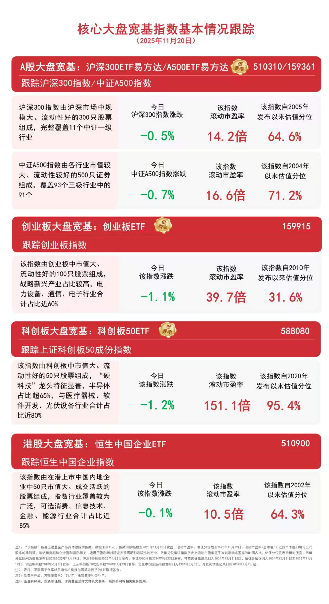 跟踪创业板指数 该指数由创业板中市值大、 流动性好的100只股票组成, 战略新兴产业占比较高,电 力设备、通信、电子行业合 计与比近60% 今日市场震荡调整,沪指高开低走收跌0.4%,板块方面,海南、银行等板块涨幅居前,美容护理、光伏设备、食品加工等板块跌幅居前。港股方面, 医药板块和对话诉,科技股延续调整,截至收盘,中证A.500指数下跌0.7%,沪深300指数下跌0.5%,创业板指数下跌1.1.%,上证科创板50成份指数下跌 1.2%,恒生中国企业指数下跌0.1%。 核心大盘宽基指数基本情况跟踪 (2025年11月20日) A股大盘宽基:沪深300ETF易方达/A500ETF易方达 (1) 510310 跟踪沪深300指数/中证A500指数 | 沪深300指数由沪深市场中规 | 今日 | 该指数 | 该指数 | | --- | --- | --- | --- | | 模大、流动性好的300只股票 | 沪深300指数涨跌 | 滚动市盈率 | 发布以来 | | 组成,完整覆盖11个中证一级 行业 | -0. 5% | 14.2倍 | 64 | | 中证A500指数由各行业市值较 | マ日 | 该指数 | 该指 ...