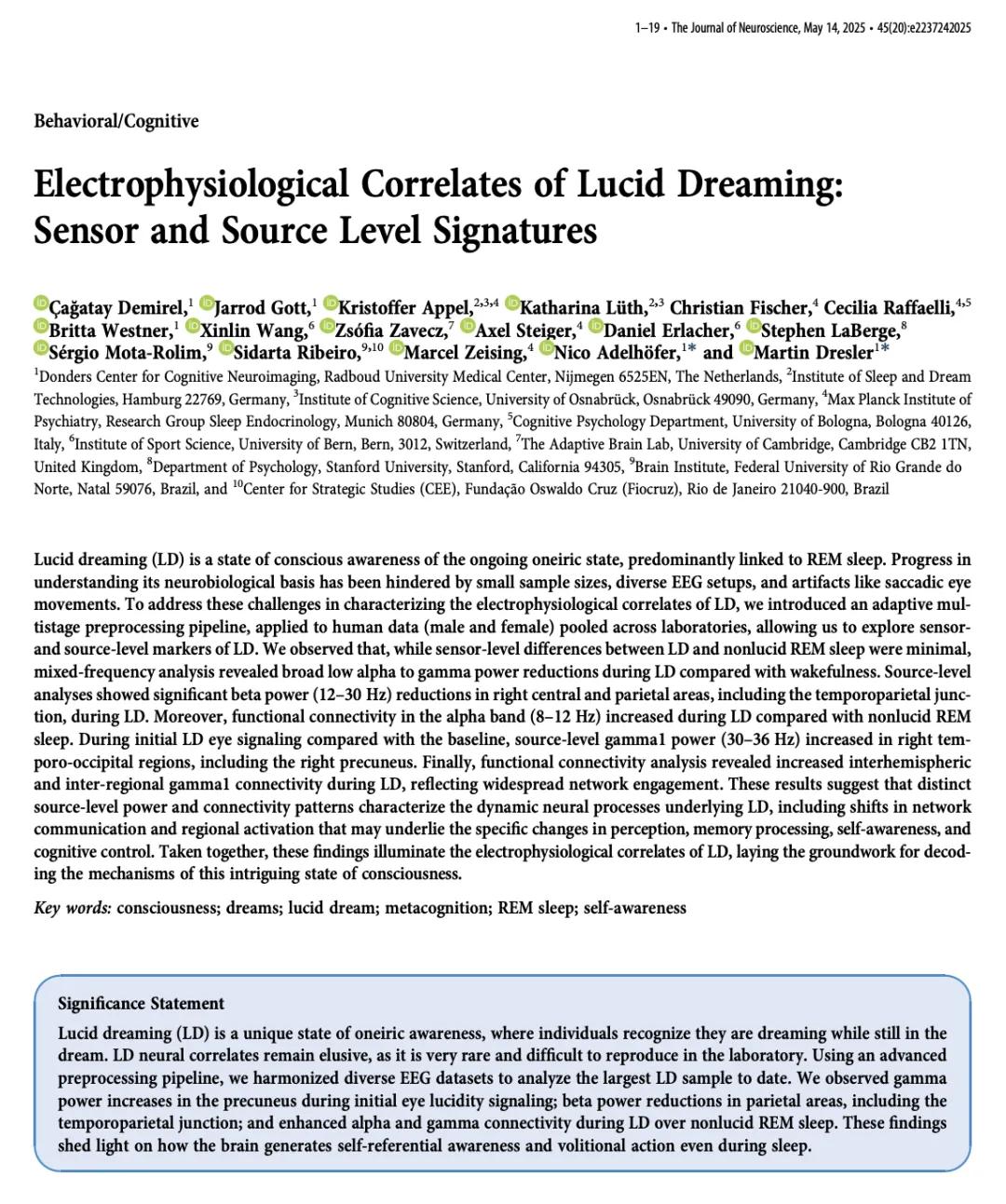 研究核心发现 - 清醒梦被确认为一种独立于清醒状态和快速眼动睡眠之外的独特意识状态,对应独特的大脑活动模式 [1] - 研究通过整合以往使用脑电图传感器的研究,构建了该睡眠研究领域规模最大的数据库 [4] 大脑活动模式特征 - 清醒梦状态下的知觉和记忆加工方式不同于非清醒的快速眼动睡眠 [5] - 对“自己正在做梦”的意识与右侧颞叶和顶叶中的β波有关,β波是一种高频脑电波,参与解决问题等有意识的思维过程,在清醒时通常由β波主导 [5] - 清醒梦开始时,右侧楔前叶中的γ波会增加,γ波是速度最快的脑波,与大脑高度警觉和专注有关 [5] - 清醒梦状态与迷幻药物在大脑层面的作用相似,迷幻体验同样与楔前叶有关,当人在闭眼状态下看到清醒意象时该区域活动会改变 [5] 认知控制与体验差异 - 清醒梦中存在较强的认知控制能力,做梦者拥有对思想、情绪和行为的控制感,而深度快速眼动睡眠中的做梦者则没有 [5] - 在体验层面,清醒梦可能比迷幻药物更进一步,迷幻药物往往导致自我消解及自我指涉性加工减少,而清醒梦则会调动自我觉知和控制的要素 [6]