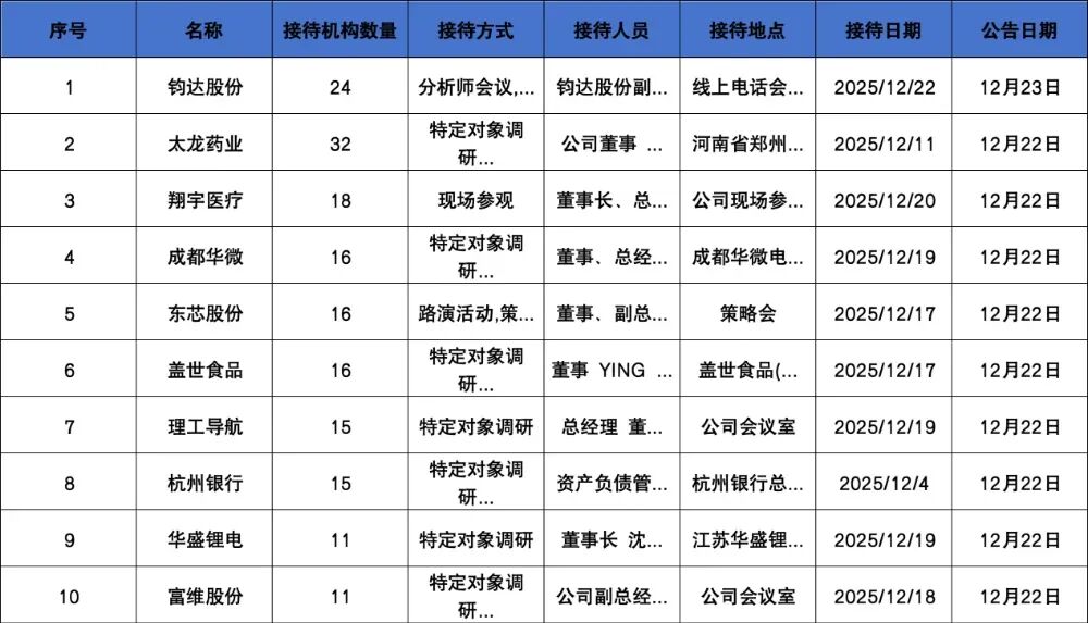 重点机构: 交银施罗德基金:费琼艳 调研摘要: 钧达股份与尚翼光电达成战略合作,共同推进钙钛矿电池技术在太空能源的应用。 公司钙钛矿技术进展:已在钙钛矿叠层电池上实现关键突破,实验室效率达32.08%,行业领先。2025年11月完成首片产业化N型+钙钛矿叠层 电池下线,具备小规模生产能力,正推进商业化应用。 | 序号 | 名称 | 接待机构数量 | 接待方式 | 接待人员 | 接待地点 | 接待日期 | 公告日期 | | --- | --- | --- | --- | --- | --- | --- | --- | | 1 | 钓达股份 | 24 | 分析师会议 ... | 钧达股份副 ... | 线上电话会 ... | 2025/12/22 | 12月23日 | | 2 | 太龙药业 | 32 | 特定对象调 研 ... | 公司董事 ... | 河南省郑州 ... | 2025/12/11 | 12月22日 | | 3 | 翔宇医疗 | 18 | 现场参观 | 董事长、总 ... | 公司现场参 ... | 2025/12/20 | 12月22日 | | 4 | 成都华微 | 16 | 特定对象调 研 . ...