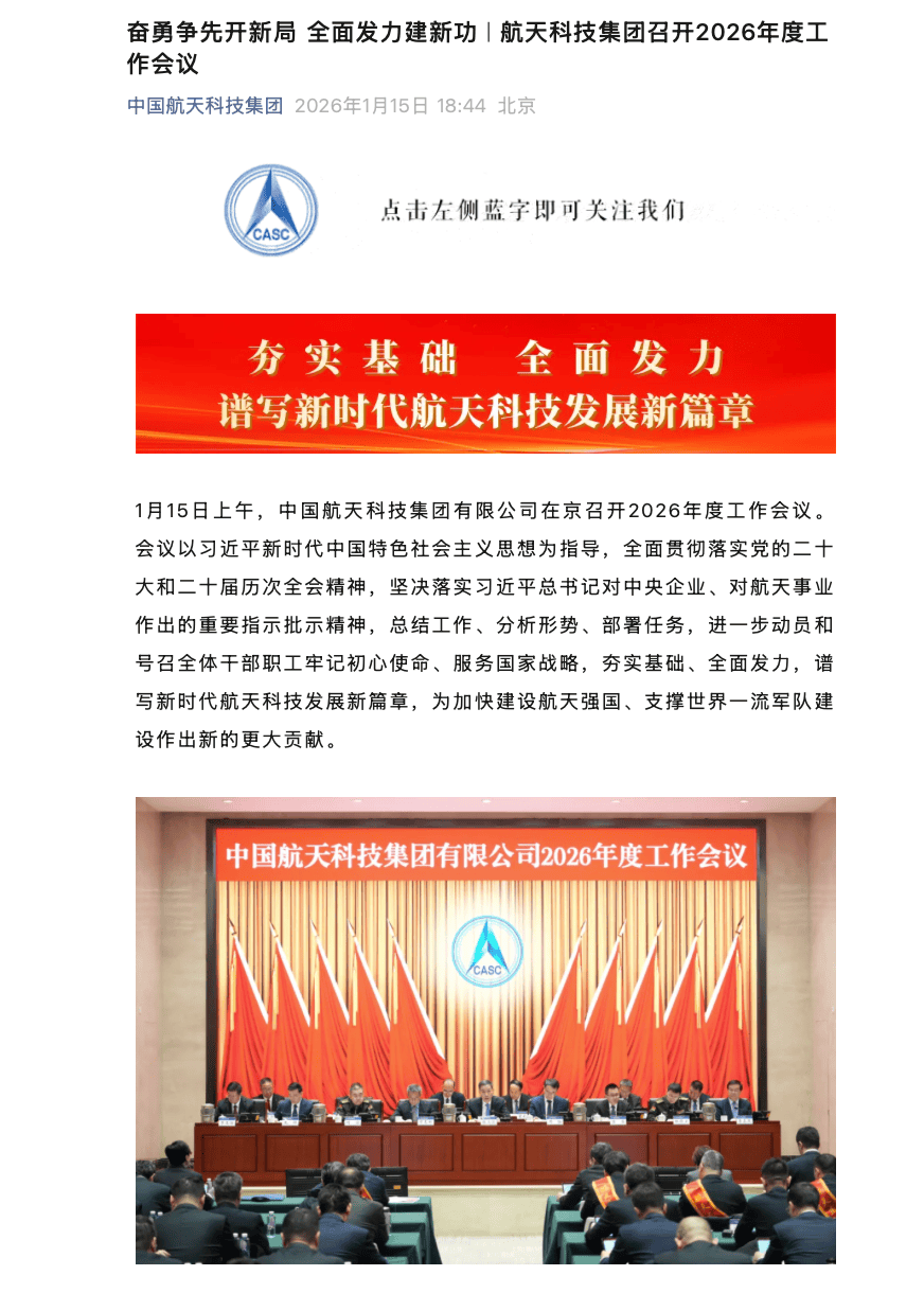 公司战略与年度工作重点 - 公司于1月15日召开2026年度工作会议,强调2026年是“十五五”规划的开局之年 [1] - 公司核心任务包括统筹宇航重大工程实施与产业化转型,并深入推进载人登月、深空探测等重大工程 [1] - 公司计划全力突破重复使用火箭技术,以加速推动航天强国建设 [1] 产业布局与结构调整 - 公司将多措并举优化产业布局并调整产业结构 [1] - 公司计划大力发展商业航天、低空经济等战略性新兴产业 [1] - 公司将前瞻布局太空数智等未来产业 [1] 市场拓展与经营目标 - 公司将强化国际市场拓展和优质履约 [1]