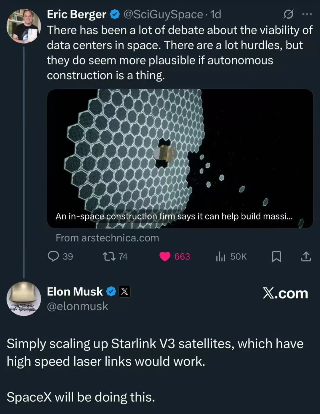 Elon Musk:扩大Starlink V3规模,进军太空算力