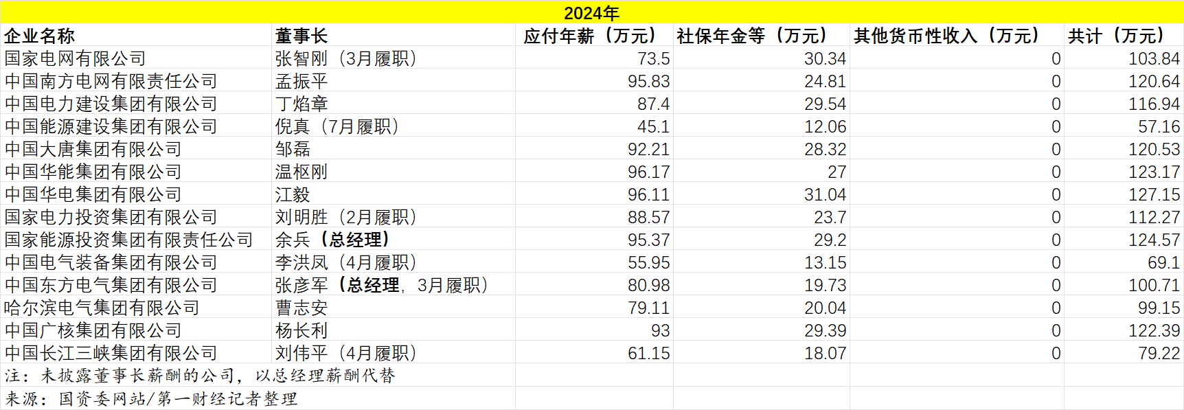 分别为国家电网有限公司、中国南方电网有限责任公司、中国电力建设集团有限公司、中国能源建设 集团有限公司、中国大唐集团有限公司、中国华能集团有限公司、中国华电集团有限公司、国家电力 投资集团有限公司、国家能源投资集团有限责任公司、中国电气装备集团有限公司、中国东方电气集 团有限公司、哈尔滨电气集团有限公司、中国广核集团有限公司和中国长江三峡集团有限公司。 央企负责人税前薪酬收入由三部分组成,包括应付年薪,社会保险、企业年金、补充医疗保险及住房 公积金的单位缴存部分,以及其他货币收入。 | | | 2024年 | | | | | --- | --- | --- | --- | --- | --- | | 企业名称 | 重事长 | | 应付年薪(万元) 社保年金等(万元) 其他货币性收入(万元) | 共计(万元) | | | 国家电网有限公司 | 张智刚 (3月履职) | 73.5 | 30.34 | O | 103.84 | | 中国南方电网有限责任公司 | 孟振平 | 95.83 | 24.81 | 0 | 120.64 | | 中国电力建设集团有限公司 | 丁焰童 | 87.4 | 29.54 | 0 | 1 ...