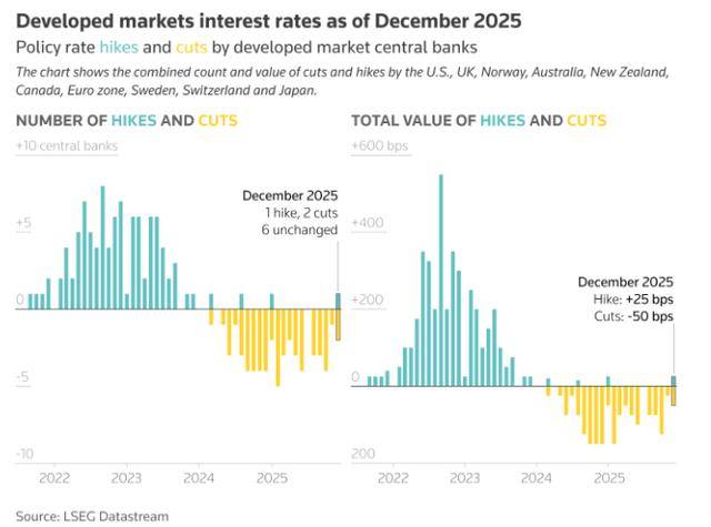 2025年全球央行货币政策概览 - 2025年全球主要发达经济体央行正以2008年金融危机以来最快的速度和最大规模实施降息,同时发展中国家的宽松政策也在加速推进 [1] - 在全球十大最活跃货币的G10央行中,有九家在2025年下调了基准利率 [1] G10央行2025年宽松力度 - 2025年G10央行合计实施了32次降息,累计宽松幅度达850个基点,这是自2008年以来降息次数最多、也是自2009年以来宽松力度最大的一年 [2] - 这与2022-2023年因俄乌冲突导致能源价格飙升而纷纷加息的局面形成鲜明反差 [4] - 日本央行是G10央行中唯一的例外,在2025年年初和年底先后两次上调了利率 [4] 2026年G10央行政策前瞻 - 部分分析师预计2026年主要央行的货币政策可能迎来重大转折,近月来多个G10央行(尤其是加拿大央行和澳洲联储)已明显转变基调,预示未来可能加息 [5] - 有观点认为欧洲央行2026年将加息,澳洲联储和加拿大央行也将接近加息 [5] - 美联储2025年每次会议要么维持利率不变要么降息,从未讨论过加息,但2026年这种局面可能改变,尤其下半年将面临更明显的双向风险 [6] - 宽松政策动能减弱,12月召开会议的九家G10央行中,仅美联储和英国央行进行了降息,日本央行则选择加息 [6] 新兴市场央行2025年宽松态势 - 新兴市场方面,12月降息仍呈密集态势,业内调查聚焦的18个发展中经济体中,本月召开会议的14家央行中有8家实施降息,累计降息幅度达350个基点 [7] - 2025年新兴经济体累计降息幅度达3085个基点(共51次行动),远超2024年的2160个基点,创下至少2021年疫情以来最大的宽松力度 [8] - 新兴市场通胀控制更为稳健,甚至优于发达经济体,这得益于政策制定者更积极的应对措施 [10] - 新兴市场央行2025年以来累计加息幅度为625个基点,仅为2024年1450个基点紧缩幅度的不到一半 [10] 新兴市场2026年政策展望 - 分析师预计2026年新兴经济体仍将进一步放松政策 [11] - 仍有许多新兴市场具备启动降息周期的条件,巴西和匈牙利等国可能率先行动,而其他国家则有望延长降息周期 [11]
