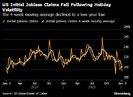 美国劳动力市场数据 - 截至1月10日当周,美国首次申领失业救济人数减少9000人,降至19.8万人,为去年11月以来最低水平,且低于所有经济学家预期 [1][3] - 作为平滑波动指标的新申请人数四周移动平均值上周降至20.5万人,创下两年来最低水平 [1][3] - 在截至1月3日的当周,持续申领失业救济人数下降至188万人 [3][5] 劳动力市场趋势与解读 - 数据显示,尽管可能受假期波动影响,但年初裁员并未出现显著增长,近期多家大型雇主宣布的裁员计划尚未转化为大规模裁员 [3][5] - 密歇根大学调查显示,近几周近三分之二受访消费者预期未来一年失业率将上升,表明消费者对劳动力市场仍持悲观态度 [3][5]