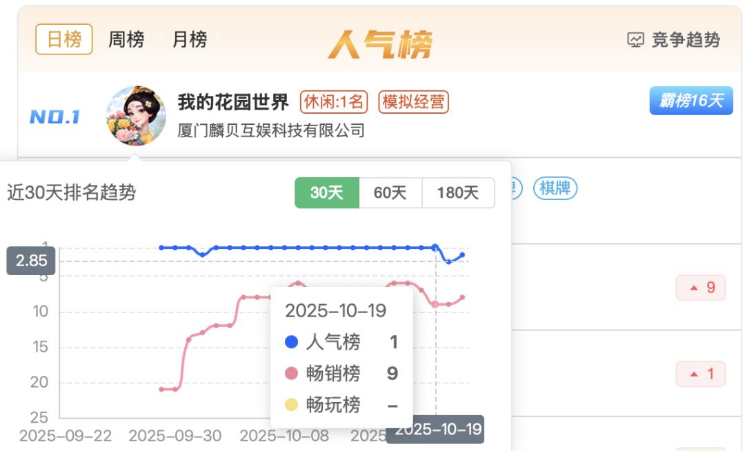 女性向游戏的又一次出圈。 今年国庆假期前,一款名为《我的花园世界》的女性向模拟经营小游戏,突然登顶了微信小游戏人气榜,并且长时间高居不 下, 几乎霸占一整个国庆假 期的榜首,霸榜时间长达16天。 (数据来源:引力引擎) 实际上,这款游戏在8月初就上线了App端,上线后就在iOS畅销榜上一路飙升,从百名开外一度闯进前20。而就在今天(10月21日),《我的花园世界》 首次进入iOS游戏畅销Top10,排名第8。 | 7 | | ▼ 2 | | --- | --- | --- | | 8 | 我的花园世界 AD 总榜:18名 厦门麟贝互娱科技有限 ... | - 8 | | 9 | | F 2 | (游戏上线以来的畅销走势) 同时,在QuestMobile今天发布的《2025手机游戏行业发展分析报告》中,《我的花园世界》也以319万的月活跃用户规模,成为近一年新上线游戏APP月 活规模TOP10之一。 可以说,谁都没想到国庆假期这段黄金时间,居然会被这样一款突如其来的"黑马"产品统治。 那么,究竟是什么让这款女性向模拟经营游戏迎来如此爆火?在笔者看来,从游戏玩法到商业活动,这款产品都有着它出色的地方。 以"轻松休 ...