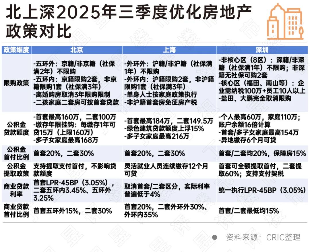 10月23日的四中全会对房地产只提了十个字:推动房地产高质量发展。此次《"十五五"建议》增加了许多,并涉及多个方面: 从以上6点来看,核心仍是推动房地产高质量发展,只是更进一步从不同维度发力。归根到底还是用"保障+市场"的方式让人民群众住上"好房子"。对行业 自身而言,这也是房地产行业摆脱旧有路径依赖、穿越周期、实现健康可持续发展的根本出路。 核心城市购房限制性政策 仍有优化空间 《"十五五"建议》在建设强大国内市场,大力提振消费部分提出"完善促进消费制度机制,清理汽车、住房等消费不合理限制性措施。" 当前房地产市场大部分限制性措施皆已退出,仅剩部分城市还有所保留,在这其中,北京、上海、深圳的限购政策最受关注。 房地产未来五年终于定了! 10月28日,新华社受权发布《中共中央关于制定国民经济和社会发展第十五个五年规划的建议》(下称《"十五五"建议》),基本确定未来五年房地产发 展方向。 2025年8-9月,北京、上海、深圳先后调整限购政策,三城均采用"分区域差异化松绑"策略,但宽松力度与范围各有侧重。 北京以五环为界划分调控梯度,五环外对京籍及社保满2年的非京籍全面不限购,五环内则维持京籍限购2套、非京籍社保 ...