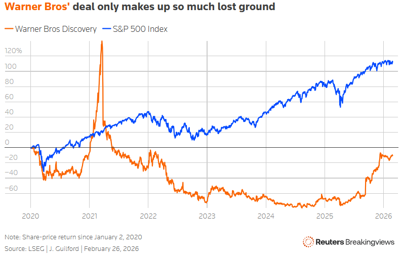 并购交易结果 - 流媒体巨头奈飞拒绝提高对华纳兄弟探索公司大部分业务的报价 派拉蒙天舞提出的全现金收购方案最终胜出 交易总价值达1110亿美元 [1] - 派拉蒙提出的每股31美元要约 优于奈飞此前达成的每股27.75美元协议 [1] - 奈飞在退出竞标后 其股价跳涨了10% [2] 交易条款与财务影响 - 华纳兄弟探索公司的股东获得了惊人的近150%的溢价 [6] - 即使派拉蒙实现其承诺的60亿美元协同效应 合并后的预期营业收入回报率也不到6% [2] - 华纳兄弟探索公司在交易谈判浮出水面之前的五年里 股价下跌了约一半 [2] 交易风险与挑战 - 派拉蒙消化更大制片厂、庞大电影库和知识产权及电视资产的能力引发严重质疑 [1] - 合并将吸引反垄断者的抨击 一组州总检察长对合并计划表示担忧 司法部已发起一项调查 [2][5] - 利息成本是一个悬念 华纳兄弟探索在与探索频道合并后已在巨额借款重压下萎靡不振 [2] 公司背景与现状 - 奈飞是一家市值3600亿美元的公司 [5] - 华纳兄弟探索公司去年其HBO流媒体业务的盈利翻了一番 [2] - 老板大卫·埃里森最终动用了其亿万富翁父亲拉里·埃里森(甲骨文创始人)来消除交易顾虑 其股份为竞标提供了担保 [1][2]