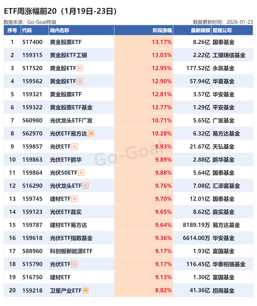 市场整体表现与风格 - 本周A股市场整体呈现震荡上行态势,主要宽基指数涨跌互现,市场风格分化明显 [1] - 国际金价近期再度刷新历史新高,带动相关ETF持续走强 [1] - 以沪深300、上证50为代表的大盘宽基ETF遭遇资金净流出,而资金转向更具弹性的赛道,TMT(科技、媒体、通信)、周期(如有色金属)等主题类ETF获得显著资金净流入,显示活跃资金追捧科技成长主线 [2] ETF资金流向 - 本周ETF资金整体净流出696.39亿元 [3] - 其中,宽基ETF净流出873.01亿元,行业ETF净流入143.04亿元,商品ETF净流入32.91亿元 [3] 涨幅居前的ETF品种 - 黄金股票ETF单周上涨13.17%,涨幅居首 [1] - 其他黄金主题ETF同样表现强劲,如黄金股ETF工银上涨13.03%,黄金股ETF 陆上涨12.95% [2] - 光伏类ETF大幅上涨,例如光伏龙头ETF广发上涨10.71%,光伏ETF易方达上涨10.28% [2] - 建材类ETF表现突出,如建材ETF 陆上涨9.70%,建材ETF易方达上涨9.64% [2] - 卫星产业ETF 副上涨8.82% [2] 新基金发行与上市动态 - 下周有多只新ETF开始认购,涵盖工业有色、光伏、有色、电池、电力、恒生生物科技等主题,例如工业有色ETF博时认购期为2026-02-02至2026-02-06,光伏ETF博时认购期为2026-01-26至2026-02-06 [4] - 下周将有4只ETF上市,包括科创芯片ETF华宝(上市日期2026-01-27)、电力ETF景顺(上市日期2026-01-27)、科创200ETF国泰(上市日期2026-01-26)、恒指港股通ETF建信(上市日期2026-01-26) [5] - 另有数只ETF已成立,等待上市,包括光伏ETF招商、港股通科技ETF平安、港股通互联网ETF基金、工业有色ETF鹏华、恒生生物科技ETF国泰、创业板ETF汇添富、科创芯片ETF广发、科创人工智能ETF南方 [5]