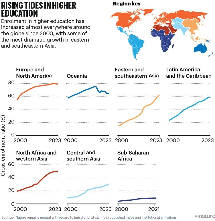 全球高等教育规模与增长趋势 - 全球大学生总数已达2.64亿,相当于世界第五人口大国 [1] - 自2000年以来,全球大学生人数翻了一倍多,跨国留学人数暴增近3倍,接近700万 [2] - 全球高等教育毛入学率(GER)从2000年的19%提升至2024年的44% [14] 区域高等教育发展差异 - 西欧和北美地区GER从2000年的61%增长至2024年的80% [10] - 中欧国家GER从42%跃升至87%,东亚与东南亚GER由15%升至62%,拉美与加勒比地区由23%升至58% [13][14] - 印度在2021-2022学年的GER为28%,目标在2035年达到50% [14] - 撒哈拉以南非洲地区GER到2021年仅为9%,高于2000年的4%,是全球高等教育阶段女性入学率仍低于男性的地区 [15] 高等教育国际化新趋势 - 跨国留学学生人数从2000年的210万增至当前的690万,约占全球学生总数的2.6% [18] - 欧盟约9%的学生赴境外学习,美国约有110万国际学生,而印度4300万在校大学生中仅4.6万为国际学生 [18][19] - 传统留学目的地(如美、英、加、澳)的国际学生增长趋缓,荷兰、韩国等国日益受欢迎 [20] - 海外分校模式兴起,2023-2024学年英国海外分校为约62.1万学生提供服务 [21] 科研格局与学科发展 - 中国STEM博士人数持续快速增长并已超过美国 [29] - 中美曾是全球最大的跨国合著论文组合,但近年增长放缓 [29] - 欧洲高等教育区(EHEA)推动学位框架与质量保障体系的互认,增强了国际合作 [24][25][26] 公立与私立教育的角色演变 - 私立高校数量快速增长,尤其在东南亚、拉美、非洲地区,非洲约一半高等教育机构为私立 [32] - 私立教育通常选择公立教育未覆盖的领域(如计算机科学、工商管理),但难以涉足博士研究或医学教育等资源密集型领域 [34] - 印度通过《国家教育政策》推动公立与私立高校合作 [34]