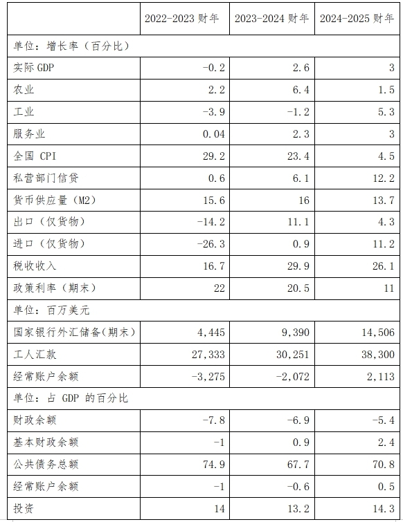 巴基斯坦国家银行(简称"巴央行")10月16日发布了《2024-2025财年巴基斯坦经济状况年度报告》, 报告显示该国2024-2025财年(2024年7月至2025年6月)宏观经济稳定性明显增强,金融领域呈现多重 积极态势,为经济复苏奠定坚实基础。 报告期内该国GDP增长3.0%,较上财年的2.6%有小幅提升,服务业和工业成为主要驱动力,分别增长 3.0%和5.3%。通货膨胀得到有效控制,CPI由上财年的23.4%大幅回落至4.5%,创八年来新低。 国际收支状况改善,经常账户实现21.13亿美元盈余,为十四年来首次。截至财年末,巴央行外汇储备 总额为145.06亿美元,同比增幅达54.48%。作为外汇重要来源之一,该国海外劳工汇款也保持了增长势 头,全年共汇回383.00亿美元。 | | 2022-2023 财年 | 2023-2024 财年 | 2024-2025 财年 | | --- | --- | --- | --- | | 单位:增长率(百分比) | | | | | 实际 GDP | -0. 2 | 2. 6 | 3 | | 农业 | 2.2 | 6.4 | 1.5 | | 工业 | -3.9 | ...