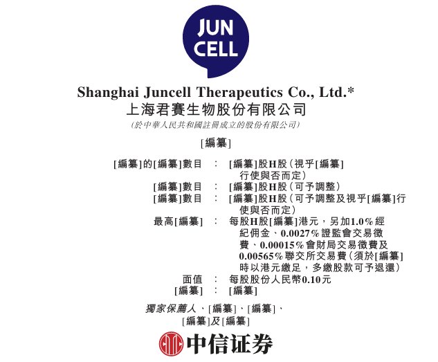 香港聯合交易所有限公司與證券及期貨事務監察委員會對本申請版本的內容概不負責,對其準確性或完整 性亦不發表任何意見,並明確表示概不就因本申請版本全部或任何部分內容而產生或因倚賴該等內容而引 致的任何損失承擔任何責任。 Shanghai Juncell Therapeutics Co., Ltd.* 上海君賽生物股份有限公司 (「本公司」) (於中華人民共和國註冊成立的股份有限公司) 的申請版本 警告 本申請版本乃根據香港聯合交易所有限公司(「聯交所」)及證券及期貨事務監察委員會(「證監會」)的要求 而刊發,僅用作提供資料予香港公眾人士。 Shanghai Juncell Therapeutics Co., Ltd.* 上海君賽生物股份有限公司 (於中華人民共和國註冊成立的股份有限公司) 本申請版本為草擬本,其內所載資料並不完整,亦可能會作出重大變動。 閣下閱覽本文件,即代表 閣 下知悉、接納並向本公司、本公司的獨家保薦人、整體協調人、顧問或包銷團成員表示同意: 倘於適當時候向香港公眾人士提出要約或邀請,有意投資者務請僅依據於香港公司註冊處處長登記的本公 司招股章程作出投資決定,招股章程的文本將於發售期內向公眾人 ...