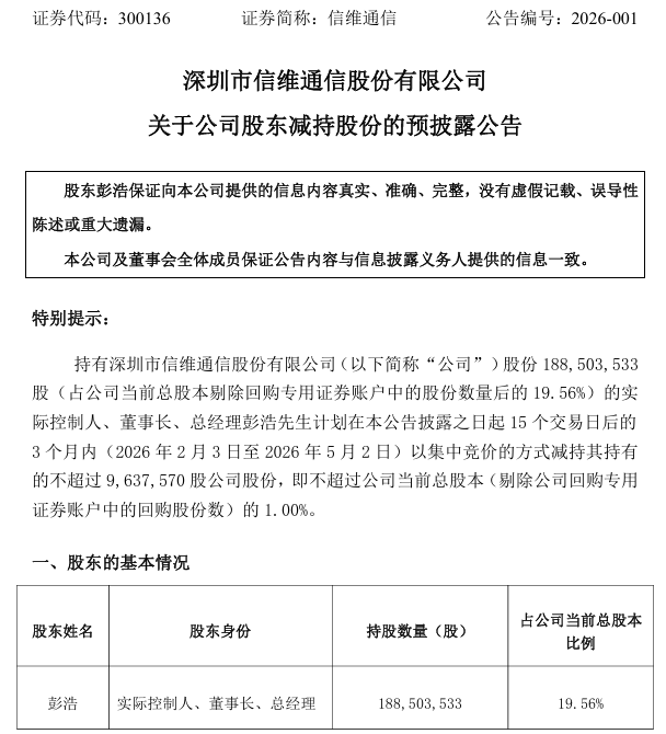 公司实控人减持计划 - 公司实际控制人、董事长、总经理彭浩计划在2026年2月3日至2026年5月2日期间,通过集中竞价方式减持不超过963.76万股公司股份,占公司当前总股本的1% [1] - 彭浩目前持有公司股份188,503,533股,占公司当前总股本比例为19.56% [5] - 若以公告日(1月12日)收盘价83.11元/股计算,本次减持计划可能套现金额超过8亿元 [6] 股价近期表现与市场反应 - 自2025年11月24日至2026年1月12日的34个交易日内,公司股价区间累计涨幅达196.93% [5] - 在宣布减持计划当日(1月12日),公司股价大幅收涨10.59%,盘中触及近期高点88.47元/股,收盘报83.11元/股,总市值达804.1亿元 [5] - 减持公告次日(1月13日),公司股票开盘走跌,盘内跌幅超过15%,午间收盘报77.54元/股,下跌6.7% [7] 公司主营业务与财务表现 - 公司主营业务为天线及模组、无线充电模组及相关产品、EMI/EMC器件、高精密连接器、声学器件、汽车互联产品、被动元件等,主要产品是射频零部件 [10] - 2025年前三季度,公司实现营业收入64.62亿元,同比上升1.1%;归母净利润为4.86亿元,同比下降8.8%;扣非归母净利润为4.29亿元,同比上升4.7% [10] - 2025年前三季度,公司经营现金流净额为12.94亿元,同比增长73.9%;EPS(全面摊薄)为0.5028元 [10] - 2025年第三季度单季,公司营业收入为27.6亿元,同比上升4.2%;归母净利润为3.25亿元,同比下降1.8%;扣非归母净利润为3.14亿元,同比上升22.1%;EPS为0.3355元 [11] - 截至2025年三季度末,公司总资产为135.73亿元,较上年度末增长1.5%;归母净资产为76.79亿元,较上年度末增长5.1% [11]