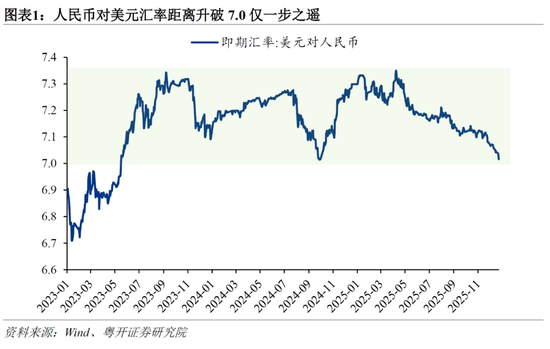 以下文章来源于粤开志恒宏观 ,作者罗志恒 粤开志恒宏观 . 在这里,一起解读中国与世界。立足中国,全球视野;宏大叙事,微观关怀。 12月25日,人民币对美元离岸汇率盘中升破7.0,在岸汇率距离"破7"也仅一步之遥。 1、2025年人民币对美元汇率显著走强,尤其是11月下旬以来呈加速升值态势,但人民币对一篮子 货币汇率仍小幅贬值。 截至12月24日,2025年人民币对美元汇率升值4%,但美元指数下跌 9.7%,表明美元贬值是人民币对美元汇率升值的主要原因。截至12月19日,人民币对一篮子货币 汇率的CFETS人民币汇率指数下降3.5%,反映出人民币对非美货币总体贬值。 2、人民币对美元汇率升值,主要受四股力量驱动: 一是美元指数走弱,人民币对美元汇率被动走 强;二是中国股市走强,人民币资产吸引力上升;三是年底出口企业结汇需求上升,同时人民币汇率 升值进一步推高结汇意愿,企业结汇与汇率升值相互促进;四是中国人民银行为保持人民币对一篮子 货币汇率稳定,引导人民币对美元汇率合理有序升值。 3、市场担忧人民币对美元汇率升值会对中国出口造成不利影响,但需要注意的是,真正影响出口 的,不是人民币对美元汇率,而是人民币对一篮 ...
