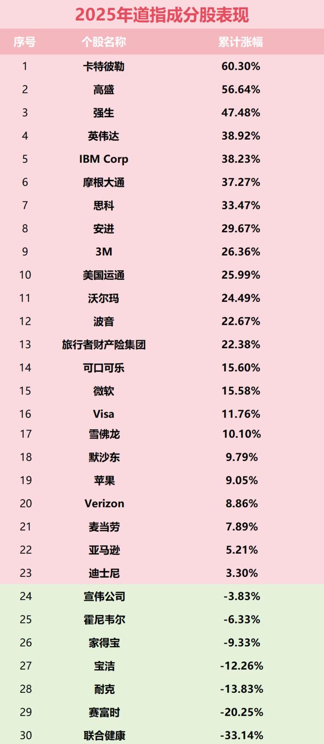 | 陸 | 个股名称 | 累计涨幅 | | --- | --- | --- | | 1 | 卡特彼勒 | 60.30% | | 2 | 高壁 | 56.64% | | 3 | 强生 | 47.48% | | 4 | 英伟达 | 38.92% | | 5 | IBM Corp | 38.23% | | 6 | 摩根大通 | 37.27% | | 7 | 思科 | 33.47% | | 8 | 安进 | 29.67% | | 9 | 3M | 26.36% | | 10 | 美国运通 | 25.99% | | 11 | 沃尔玛 | 24.49% | | 12 | 波音 | 22.67% | | 13 | 旅行者财产险集团 | 22.38% | | 14 | 可口可乐 | 15.60% | | 15 | 微软 | 15.58% | | 16 | Visa | 11.76% | | 17 | 雪佛龙 | 10.10% | | --- | --- | --- | | 18 | 默沙东 | 9.79% | | 19 | 苹果 | 9.05% | | 20 | Verizon | 8.86% | | 21 | 麦当劳 | ...