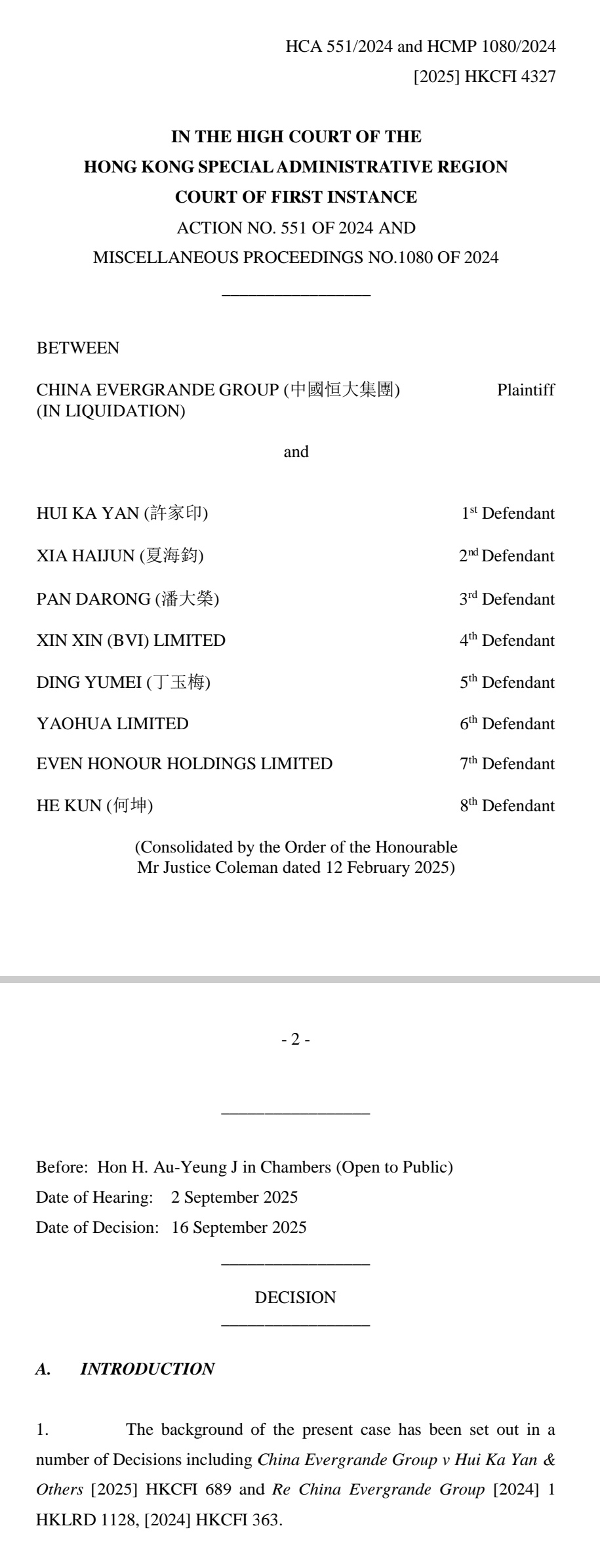 资产接管判决核心内容 - 香港高等法院对许家印发出全球禁制令,禁止其处置全球范围内价值不超过77亿美元(约合人民币550亿元)的资产[1] - 法院在最新判决中指定中国恒大集团清盘人为许家印家族相关资产的接管人[1] - 清盘人共收到187份债权申报,总额高达约3500亿港元,而被冻结的资产价值约550亿元,远不足以覆盖债务[13] 被接管资产具体清单 - 接管资产覆盖三大核心类别:33家境外公司的权益、7个银行账户内的资金、以及私人飞机、豪华汽车、游艇等个人贵重物品[2] - 7个银行账户中,3个是许家印个人名下直接持有,开户行包括中国银行香港、汇丰银行和星展银行;另外4个通过4家境外公司间接持有,其中两家由许家印控制,两家由前妻丁玉梅控制[8] - 接管的实物资产包括两辆劳斯莱斯幻影,车牌分别为内地牌照"粤A98888"和香港牌照"HD3333"[10] - 被接管的物业分布在香港、英国和美国等地[9] 许家印家族资产转移路径 - 自恒大2009年上市至2022年期间,许家印与丁玉梅夫妇合计分得红利已超500亿元[3] - 利润以股息形式通过多层红筹架构上划,最终流入由二人实际控制的离岸公司账户[4] - 2019年前后,许家印、丁玉梅夫妇在美国设立规模高达23亿美元(约合人民币163.8亿元)的单一家庭信托基金,并明确指定其二子为受益人[5] - 清盘人已正式向美国特拉华州法院提交申请,要求依据"欺诈性转移"条款撤销该23亿美元家族信托,案件已进入证据交换阶段[18] 恒大集团剩余资产状况 - 公司最核心的家底是截至2023年中约1.9亿平方米的土地储备[14] - 旗下两家上市子公司为恒大物业和恒大汽车[15] - 恒大物业管理着3000个物业项目,2024年实现营收127亿元、净利润10亿元,手握27亿元现金[16] - 恒大汽车截至2024年6月30日总资产163.69亿元,负债却高达743.5亿元,资不抵债金额近580亿元,现金仅剩3900万元[16] - 恒大汽车2024年上半年营收仅4913万元,同比暴跌76%,同期净亏损扩大至202.55亿元[16] 丁玉梅生活费安排 - 英国法院批准了丁玉梅每月2万英镑(约人民币19万元)的生活费豁免,以保障其基本生活需求[19] - 该安排系英国法院基于保障基本生活所需而作出的裁定,具有法律效力,非经法定程序不得随意变更[20] - 如果清盘人意图对该生活费额度进行调整,必须向英国法院提出申请并取得新的批准[20]
