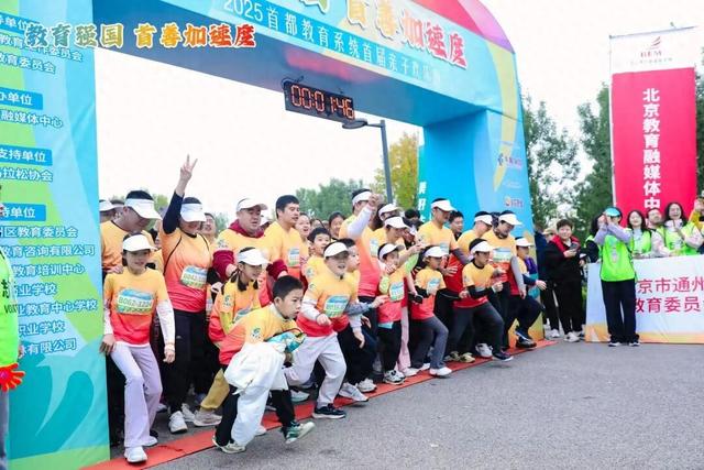 10月12日一早,在《歌唱祖国》的歌声中,"教育强国 首善加速度"2025首都教育系统亲子欢乐跑在通州区城市绿 心森林公园南门正式开跑。这是首都教育系统开展的首届亲子欢乐跑活动,400组家庭通过奔跑的形式在孩子成长 道路上留下专属印记。 10月12日,2025首都教育系统亲子欢乐跑开跑。北京教育融媒体中心供图 三所职校学生自制茶点饮料,爱心"投喂"参赛家庭 此次欢乐跑分5.5公里和2.5公里两个组别,不同的赛道里程满足了不同年龄孩子们的需求。有趣的是,所有参加活 动的家庭成员身上的号码牌都是根据生日特别定制。 早晨8点不到,各个家庭的成员们便陆续赶到现场,虽然清晨的温度略低,但大家热情高涨,不少家长和孩子不仅 穿着专业的跑步服饰,还带着专业的摄像设备,不停打卡拍照。 9时许,北京市委教育工委副书记、市教委主任李奕,北京市委教育工委委员、市教委副主任王攀;通州区人民政 府副区长董明慧,北京教育融媒体中心党委副书记、主任孟科军等领导为活动鸣枪发令。 随着发令枪响,在欢呼声中,各组家庭同步起跑,沿途志愿者不断地给参赛家庭加油,小蛋糕、饼干、能量饮 料……在沿途的补给站,不少"佛系"家庭停下来陪着小朋友品尝美食。 赛 ...
