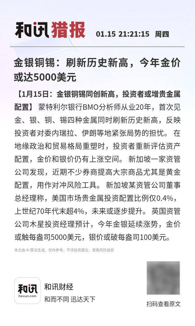 贵金属及基本金属市场表现 - 金、银、铜、锡四种金属价格同时刷新历史新高,为从业20年的分析师首次见到[1] 价格上涨驱动因素 - 投资者对委内瑞拉、伊朗等地紧张局势的担忧是推动金属价格上涨的因素之一[1] - 在地缘政治和贸易格局重塑的背景下,投资者正在重新评估其资产配置[1] 市场观点与价格预测 - 分析师认为金价和银价仍有上涨空间[1] - 英国资管公司木星投资经理预计,今年金银价格将延续涨势[1] - 英国资管公司木星投资经理预测,金价可能触及每盎司5000美元,银价可能突破每盎司100美元[1] 投资者配置行为 - 近期不少券商提高了大宗商品,尤其是黄金的配置比例,将其用作对冲风险的工具[1] - 新加坡某资管公司董事总经理指出,美国市场贵金属投资配置比例目前仅为0.4%,而在上世纪70年代末曾超过4%,未来该比例可能逐步提升[1]