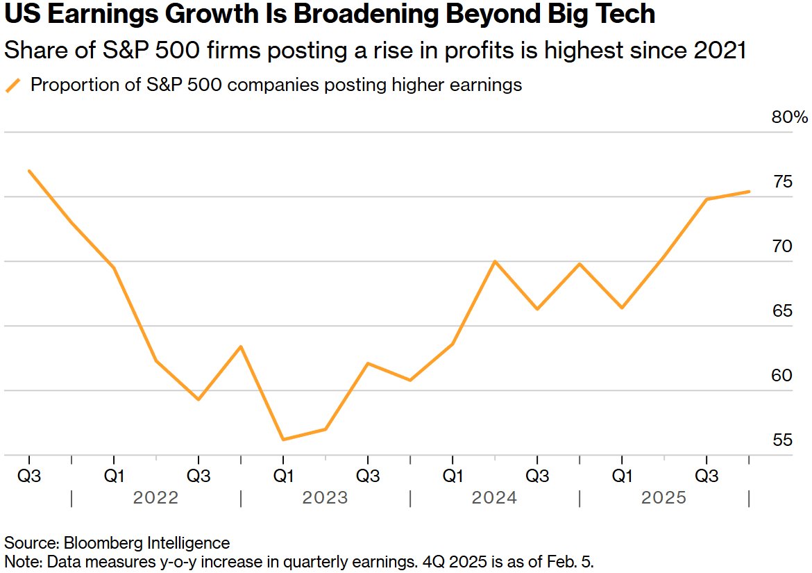 标普500指数成分股公司盈利增长概况 - 在已公布业绩的标普500指数成分股公司中,超过75%的企业实现利润同比增长,这是自2021年第三季度以来的最高比例 [1] - 这一数据可能缓解市场对企业利润增长仅由少数科技巨头驱动的担忧 [1] 近期市场表现与担忧 - 本周标普500指数下跌了2%,预计将创下自10月10日以来最大的单周跌幅,科技股领跌 [5] - 市场担忧源于对人工智能领域投资回报的质疑,以及对易受AI冲击行业和贵金属价格波动的担忧 [5] - 自2022年底以来,所谓“科技股七巨头”的股价涨幅达到惊人的310%,引发了市场对股市泡沫的忧虑 [1] 市场结构变化与广泛性增长 - 标普500等权重指数(削弱了科技权重影响)今年上涨了3.5%,表现优于市值加权基准指数 [5] - 最新的财报季表明,包括工业、消费品和医疗保健在内的领域已开始驱动指数回报,且这一趋势预计将进一步延伸 [5] - 增长正变得更加充沛,盈利也变得更加广泛,投资者并非必须投资科技公司不可 [5] 非科技公司的突出表现 - 通用汽车公司在公布强劲的盈利前景后股价大涨9% [5] - 宝洁公司因美国销售复苏的迹象而获利 [5] 未来盈利趋势预测 - 包括摩根大通和高盛集团在内的策略师预计,在强劲经济增长前景支撑下,盈利面扩大的趋势将在未来几个月持续 [8] - 2026年上半年强劲且加速的经济增长步伐,相较于市场上的巨头公司,能为小型股和更具周期性的股票创造更大的近期利好 [8] - 分析师预测,标普500指数中最大的七家科技股与其余493家公司之间的盈利差距将在今年余下时间内缩小 [8] - 继去年利润激增28%后,“七巨头”在2026年的利润预计将增长18% [8] - 该指数其余成分股的利润增长预计将从2025年的8%加速至本年度的12% [8]