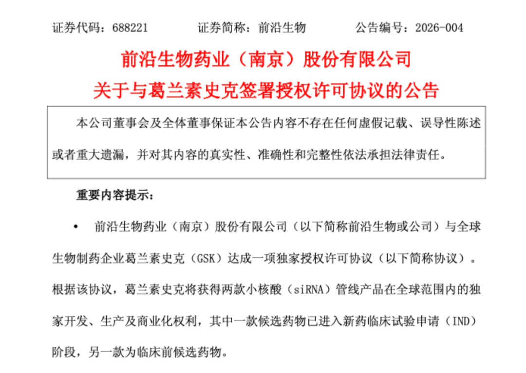 公司与GSK授权协议核心 - 前沿生物将旗下两款小核酸在研产品的全球权益授予跨国药企葛兰素史克[1] - 公司获得4000万美元首付款及1300万美元近期里程碑付款[3] - 公司后续有望获得最高9.5亿美元的里程碑付款,交易总金额累计超过10亿美元,并享有全球净销售额的分级特许权使用费[3] 协议具体分工与公司获益 - 授权的一款产品已进入IND阶段,另一款处于临床前阶段[4] - 前沿生物负责其中一款产品在中国的I期临床试验,以及另一款产品的IND支持性研究[4] - GSK主导两款产品后续的全球临床开发、注册申报及商业化[4] - 合作将为公司带来可观现金流,助力核心研发与技术平台升级,并借助GSK资源加速管线国际化价值转化[4] 小核酸药物行业趋势 - 小核酸药物因研发周期短、治疗领域广、疗效持久、成功率高等优势,成为全球生物医药热点[5] - 适应症正从罕见遗传病向心血管、代谢等大规模慢性病领域拓展[5] - 递送系统等技术突破及大型药企频繁的并购与合作持续推高赛道热度[5] 近期行业动态与竞争格局 - 2026年以来,圣因生物与罗氏达成总金额达15亿美元的RNAi疗法授权合作[6] - 瑞博生物登陆港交所,上市首日涨幅超过41%[6] - 中国生物制药以12亿元全资收购国内siRNA企业赫吉亚[6] - 目前中国本土企业自主研发的小核酸药物尚未有获批上市产品,国内上市产品均为跨国药企原研[6] - 多家国内企业已进入临床阶段,如浩博医药、瑞博生物、舶望制药、悦康药业等,石药、恒瑞等公司也在推进临床管线[7] 行业前景与公司定位 - 随着技术成熟和大型药企加码,小核酸药物的应用正从罕见病向高血脂、高血压、减重等常见慢病延伸,行业前景广阔[8] - 前沿生物与GSK的合作是公司技术实力的体现,也为中国小核酸药物企业的国际化路径增添新案例[8]