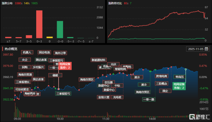 市场整体表现 - A股三大指数小幅上涨,沪指涨0.55%报3976点,深证成指涨0.19%,创业板指涨0.29% [1] - 全市场成交额2.13万亿元,较前一交易日缩量2169亿元 [1] - 超3500只个股上涨 [1] - 中证2000指数表现最佳,上涨0.90%,北证50指数下跌0.98% [2] 行业板块表现 - 林木板块领涨,涨幅达4.37%,石油天然气板块上涨3.40%,煤炭板块近五日上涨2.71% [2] - 文化传媒板块上涨2.60%,发电设备板块上涨2.41%,休闲用品板块上涨1.86% [2] - 钍基熔盐概念走高,东华科技涨停 [3] - 海南板块大涨,海马汽车、洲际油气等多股涨停 [3] - 船舶制造板块拉升,国瑞科技涨超12% [3] - 广电板块活跃,东方明珠涨停,游戏、短剧概念、空间站概念及文化传媒等板块涨幅居前 [3] - 小金属板块走低,金力永磁领跌 [3] - 黄金交易税收政策调整致珠宝首饰板块下挫,潮宏基跌停 [3] - 电池股普跌,博力威跌近7%,复合集流体、贵金属等板块跌幅居前 [3]