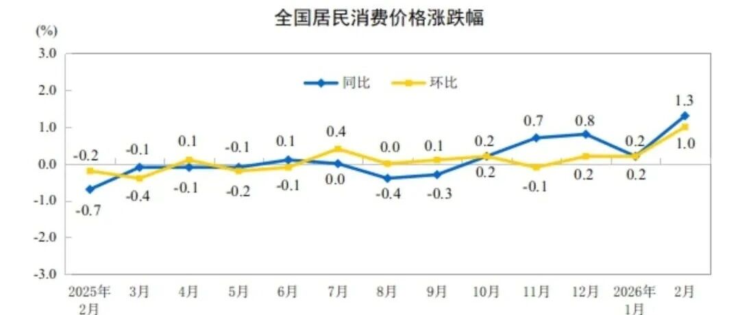 【数据发布】2026年2月份居民消费价格同比上涨1.3%