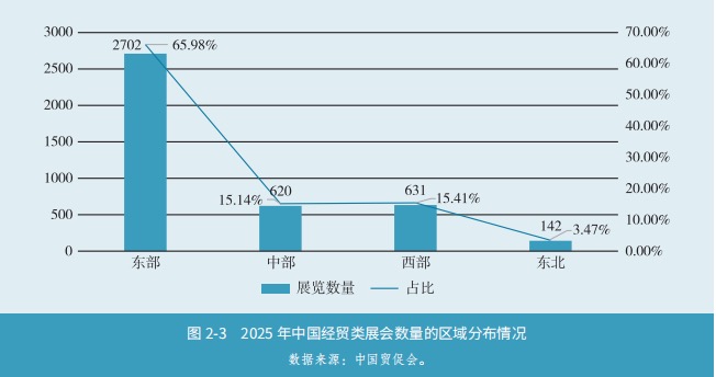 城市会展经济发展呈现出国际、区域、特色三级梯队同场竞技的态势。 2025年,我国举办经贸类展会4095项,总展览面积达1.59亿平方米,均创历史新高。 1月23日上午,中国贸促会在2026年中国会展经济国际合作论坛上发布的《中国展览经济发展报告2025》(下称《报告》)公开上述数据。 《报告》显示,人工智能、智能网联车等前沿领域成为展会新热点。28个中国展会入选全球商展100大榜单,位居全球第二,其中上海(16个)入选数量位 居全国第一。各地政府持续加大对展览业的支持力度,中西部地区展会数量占比增速高于全国平均水平。"会展 +"融合赋能成效显著,精准对接消费升级与 产业转型需求。 办展区域格局悄然生变 2025 年,中国经贸类展会仍呈现区域集聚特征,但长期以来东部地区的主导格局正在悄然变化。 《报告》显示,东部地区举办展会数量占比有所下降,中部、西部地区展会数量占比小幅增长。从数量看,2025年东部地区凭借雄厚的经济基础、完善的基 础设施和庞大的市场需求,共举办经贸类展会2702项,占比65.98%。中部和西部地区分别为620项和631项,分别占15.14%和15.41%,同比增加11.51%和 14.94% ...