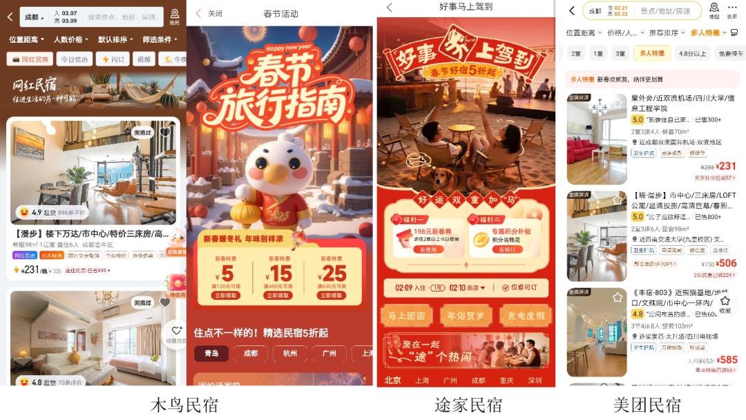2026年春节民宿市场总体表现 - 2026年春节假期为2月15日至2月23日,共计9天,被称为“史上最长春节档”,为民宿市场提供了订单突破的有利条件 [1] - 木鸟民宿报告显示,春节假期民宿订单较去年同期上涨79.6%,途家民宿连住三天订单增长35%,今年春节有望成为最热春节 [1] 木鸟民宿竞争策略与表现 - 平台在春节预测报告中给出了接近80%的订单增长预期,预计保持高增长率问题不大 [4] - 产品设计上,APP在房源细分类型上设有“网红民宿”、“今日优选”、“闪订”等专属标签,以特色体验和品价比精准覆盖95后群体与家庭游用户的品质需求 [4] - 春节专题活动提供平台优惠+常规优惠的二重礼,平台优惠为110元满减券包,用户登录即可领取,全平台可用 [4] - 平台报告显示,两居室及以上房型订单占比达64%,较去年春节上升5%,表明其全龄层用户认可度较高 [4][9] - 平台重心仍围绕基本盘的年轻用户群,信息流前端房源以一居室或两居室特色民宿为主,旨在争取由年轻人主导决策的近半数旅游过年家庭市场 [11][12] 途家民宿竞争策略与表现 - 春节专题活动的卖点由连住优惠和多人整租两部分组成 [5] - 连住优惠实为此前各平台都有的常态化内容,被包装为节日专属,以北京民宿为例,连住两晚折后价1322元,优惠239元,相当于95折 [5] - 多人整租是其核心打法,主要瞄准商旅用户的全家出游度假需求,专题页面房源多为四室以上的整租房源,意在提高ARPU值 [5] - 平台面临潜在挑战,作为携程分支业务,其主站交易量此前比携程集团带来的交易量少,最大流量入口携程被查可能影响其春节订单增长 [6] - 平台聚焦商旅用户的跨代度假需求,主打高价整租别墅,意在覆盖细分市场 [11][12] 美团民宿竞争策略与表现 - 在美团主站中,酒店与民宿入口均整合进“美团旅行”,使得美团民宿的主体性降低 [6] - 主站酒店频道的春节活动优惠类目未体现民宿相关内容,仅在专题子标题中有体现 [6] - 美团民宿APP端上线了“多人特惠”细分标签,主要瞄准年轻人聚会场景,形成差异化定位 [6] - 平台起家于学校、医院周边日租房,房源丰富性仍存疑 [6] - 平台主打经济日租房与聚会轰趴民宿,凭借绝对低价覆盖最基础住宿需求,定位“向下沉” [12] 行业竞争格局与趋势 - 2026年春节档三大民宿预订平台走出了截然不同的竞争路径,呈现出鲜明的“多元”特征 [11] - 木鸟民宿定位“合家欢”,依靠年轻人与特色民宿优势,覆盖各价格带抢夺全龄层用户 [12] - 途家民宿定位“大而贵”,主打高价整租别墅,意在覆盖商旅用户的度假需求 [12] - 美团民宿定位“向下沉”,主打经济日租房与聚会轰趴民宿,凭借绝对低价覆盖最基础住宿 [12] - 差异化的人群定位和争夺扩大了整个春节档民宿市场容量,让更多圈层、年龄层和需求的用户都能找到合适房源,从而最大化地将计划出游用户转化为实际订单 [12] - 行业客群结构出现变化,包括亲子家庭的品质化以及“长住客”群体的兴起,正契合今年春节档的表现 [10]