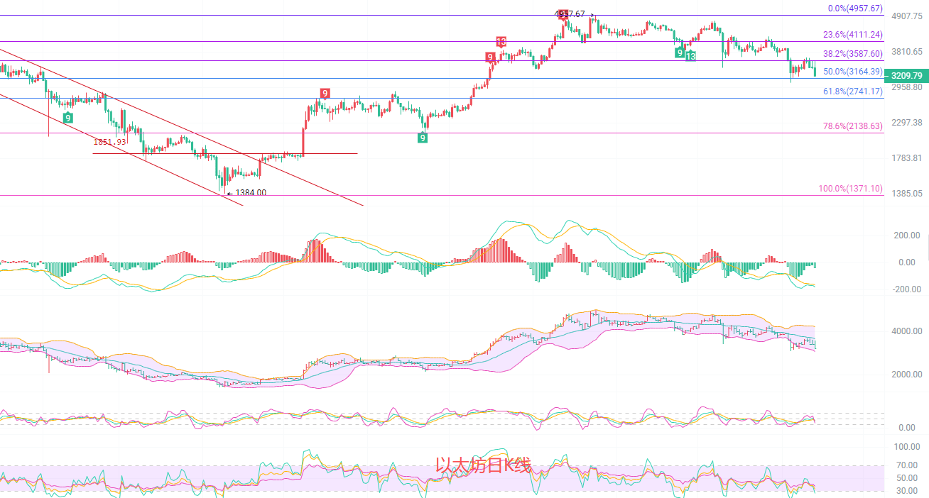 以太坊价格走势分析 - 以太坊当前价格为3466美元,日K线最高触及3478美元,最低下探至3165美元 [1][3] - 日线级别技术指标显示整体趋势偏空,EMA趋势指标为空势,MACD指标缩量增筹,DIF和DEA呈死叉扩散状态 [3] - 四小时K线显示价格从低点3055美元反弹至0.786斐波那契阻力位3460美元,EMA30均线阻力位于3600美元,0.618斐波那契压力位关注3780美元 [5] 关键技术点位与操作策略 - 日K线显示0.5斐波那契分割线支撑有效,位于3170美元附近,当前布林带通道支撑关注3455美元 [3] - 四小时级别关键阻力位为布林带中轨3555美元,若价格主力实体突破3460美元,则MACD可能形成金叉并开启放量上行走势 [5] - 短线操作建议观望为主,看多但不追多,南下试仓点为3550至3600美元不破位,北上试仓点为3550至3600美元破位,止损均设置为30点 [5] 市场情绪与交易理念 - 强调交易的根本是生存,其次才是收益,建议投资者形成并不断完善自身的交易思路,以保障本金安全为核心 [1] - 指出当前市场为猴市(震荡市),只要懂王不卸任,类似行情可能常态化,建议投资者等待趋势明朗后再进行操作 [1][5]