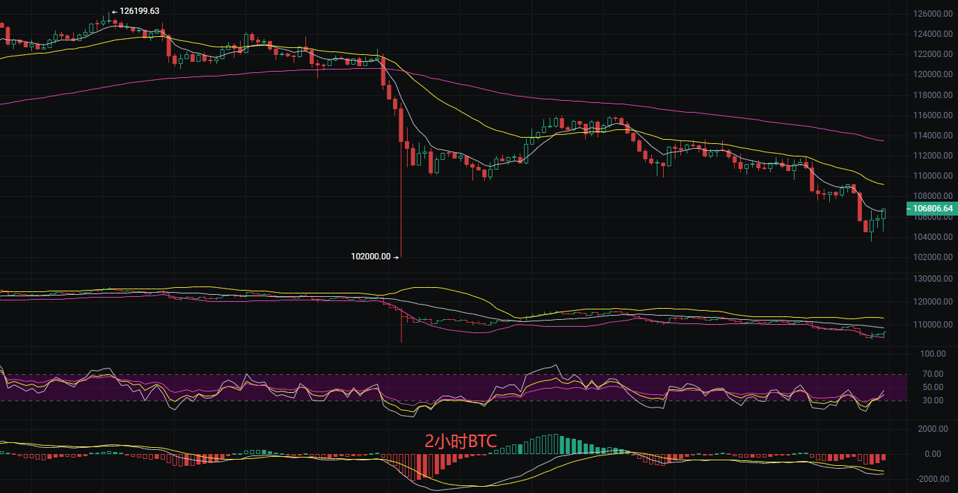比特币市场分析 - 比特币现价106,400美元,从高位115,166美元回落至106,288美元,日线连续四日收阴,形成明确下跌趋势 [1] - 技术指标显示死亡交叉,EMA呈现空头排列,MACD 2小时级别空头力量占据主导,2小时级别抛压较重,整体趋势偏弱 [1] - 成交量极度萎缩形成显著量价背离,市场参与度低,可能限制价格进一步下行空间,关键支撑位在102,000美元附近 [1] - 短线交易策略为价格触底104,000美元后做多,目标106,000美元,止损103,500美元;或在106,500美元做空,目标104,000美元,止损107,000美元 [3] 以太坊市场分析 - 以太坊现价3,918美元,接近关键支撑位3,400美元,并伴随看涨吞没形态,为短期反弹提供潜在支撑 [3] - 日线持续下跌形成连续阴线,2小时级别价格在暴跌后出现小幅反弹,但整体仍处于下降趋势,高点逐步降低,低点不断刷新 [3] - 技术指标显示价格位于短期和长期均线之下,均线向下倾斜,MACD 2小时和日线级别均处于死叉状态,EMA 2小时呈空头排列,短期压力集中在3,800美元附近 [3] - 成交量极度缩量表明市场动能不足,短期内或维持震荡走势,需关注支撑位有效性 [3] - 短线交易策略为价格触底3,700美元后做多,目标3,850美元,止损3,650美元;或在3,850美元做空,目标3,750美元,止损3,900美元 [5]