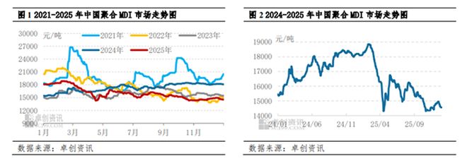 2025年第四季度及2026年第一季度中国聚合MDI市场总结 四季度市场整体回顾 - 四季度中国聚合MDI市场价格呈现先跌后震荡走高再回落的走势 [1] - 以华东市场为例,季度均价为14617元/吨,环比下跌6.26%,同比下跌18.26% [1] - 季度内高点出现在12月中旬,均价为14950元/吨,低点在10月下旬,均价为14300元/吨 [1] 四季度价格驱动因素:需求侧 - 四季度下游整体需求低迷,室外工程受天气及供暖季影响进入传统淡季 [3] - 冰箱冷柜行业因消费补贴政策收紧及美国关税增加影响,10-11月产量约为2340万台,同比减少6.07% [3] - 出口市场表现不佳,10-11月中国聚合MDI出口量为12.81万吨,同比大幅减少35.63% [3] - 美国反倾销措施阻断中国聚合MDI出口至美国的路径,导致套利窗口难以打开 [3] 四季度价格驱动因素:供应侧 - 12月上中旬,国内外厂家纷纷上调报价,对市场产生明显提振作用 [4] - 2025年11月至2026年1月期间,国内外多套MDI装置计划停车检修,涉及产能包括宁波100万吨、上海60万吨、重庆46万吨、沙特40万吨及横兰28万吨 [6] - 11-12月进口货源供应稳定,尤其科思创日本货源增加,缓解了现货紧张局面,对12月下旬市场形成利空 [7] 2026年一季度市场展望 - 供应压力预计增大,随着前期检修的共206万吨产能装置陆续重启,国内市场整体供应将增加 [8] - 当前市场主力牌号货源价差缩小,PM200价格在14000-14200元/吨,而M20S/44V20/5005价格在13900元/吨附近,价差小于正常的200元,可能导致非PM200货源库存积累 [8] - 下游及贸易商因吸取2025年初库存累积及价格大跌的教训,在“不买跌”心态下,年前备货态度谨慎 [8] - 叠加2月春节假期影响,交易或显清淡,社会库存可能累积至3月份,一季度市场供需矛盾或持续突出,市场难言乐观 [9]