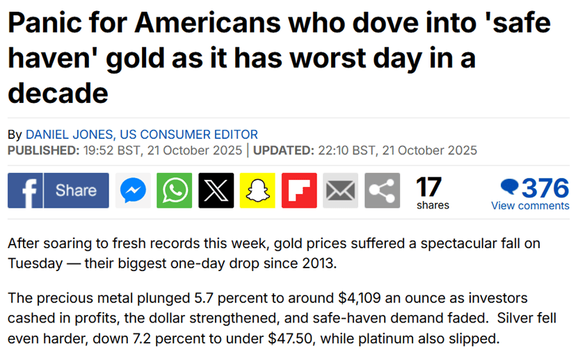 贵金属市场行情 - 现货黄金最深跌幅达6.3%,报约4080美元/盎司,创逾12年来最大单日跌幅 [1] - 现货白银一度重挫8.7%,报47.89美元/盎司,为2021年2月以来最差单日表现 [1] - COMEX黄金期货收跌5.07%报4138.5美元/盎司,COMEX白银期货收跌6.27%报48.16美元/盎司 [1] 价格波动原因分析 - 贵金属大跌主要由于避险情绪降温,美元走强,以及投资者因担心近期历史性的上涨令其估值过高而锁定利润 [1] - 有分析师表示,黄金交易量在连续第八周上涨的道路上创下了多年高位,上涨速度过快已进入不可持续状态 [3] - 分析师认为很难判断何时止盈 [3] 历史价格表现与市场参与情况 - 2025年内,黄金价格涨幅超过50%,受到对通胀、地缘政治以及市场动荡的担忧推动 [1] - 最初拉动金价飙升的银行和对冲基金发挥了作用,普通美国人也加入热潮,交易平台报告称对金属的兴趣激增 [1] 区域市场需求动态 - 为迎接印度教传统节日,印度民众购买金银珠宝的热情空前高涨 [3] - 与往年不同,今年印度消费者对白银制品的追捧超过了黄金,需求激增加剧了困扰全球多年的白银供应短缺 [3]