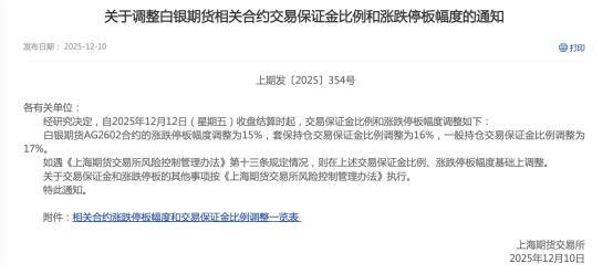 来源:环球网 12月10日晚,上海期货交易所(下称"上期所")发布通知,调整白银期货相关合约的交易保证金比例及 涨跌停板幅度,以应对近期市场波动并强化风险防控。 在此背景下,上期所实施"提保+扩板"双重调控。有分析人士认为,此举旨在预防市场过度投机及潜在 逼空行情,更好服务实体产业链的风险管理需求。交易所调控意图明确,即引导市场理性交易,防范短 期价格过度波动。 据悉,当前全球主要白银库存均处历史低位。截至2025年12月5日,上期所白银库存量为688吨,年内累 计减幅过半;伦敦金属交易所白银库存较2019年峰值下降约75%,流动性风险有所加剧;纽约COMEX 库存因跨境运输瓶颈未能有效缓解,现货短缺问题较为突出。 上海期货交易所 根据通知,自2025年12月12日(星期五)收盘结算时起,白银期货AG2602合约的涨跌停板幅度由现行 的14%上调至15%;套保持仓交易保证金比例由15%上调至16%;一般持仓交易保证金比例由16%上调 至17%。 此前,上期所已于12月8日发布提示称,近期国际形势复杂多变,贵金属市场波动较大,要求各有关单 位采取相应措施,提示投资者做好风险防范,理性参与交易,共同维护市场平稳运 ...