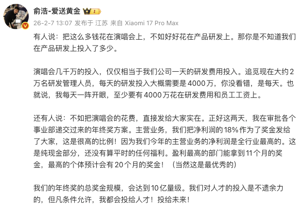 公司回应与战略澄清 - 公司创始人通过社交媒体回应外界对其赞助演唱会投入过高的质疑,强调该投入相对于公司的整体研发支出规模极小 [1][4] - 演唱会投入金额为数千万级别,而公司每日的研发费用投入约为4000万元,演唱会花费仅相当于一天的研发投入 [1][4] 研发投入与团队规模 - 公司目前拥有约20,000名研发管理人员,构成了庞大的研发团队 [1][4] - 公司每日的研发投入(包含研发费用和员工工资)高达约4000万元 [1][4] 激励机制与利润分享 - 公司主营业务将净利润的18%作为奖金发放给员工,该比例被描述为很高 [2][5] - 公司声称其主营业务净利润为全行业最高水平 [2][5] - 盈利最高的部门员工可获得相当于11个月薪资的奖金,表现最优秀的个体员工预计可获得相当于20个月薪资的奖金 [1][2][4][5] - 公司年度年终奖的总奖金规模预计将达到10亿量级 [1][2][4][5] 公司文化与人才战略 - 公司强调其对人才投入不遗余力,并表示在条件允许的情况下会优先投资于人才 [2][5]