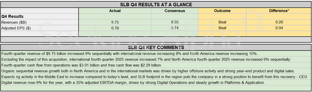 核心业绩与股东回报 - 第四季度营收97.5亿美元,同比增长5%,超出市场预期的95.5亿美元 [1] - 第四季度调整后每股收益0.78美元,超出市场平均预期的0.74美元 [1] - 公司宣布2026年将通过股息和股票回购向股东返还超过40亿美元 [1][2] - 董事会批准将季度现金股息上调3.5%,新股息将于4月2日发放 [2] - 第四季度经营活动现金流为30.1亿美元,自由现金流为22.9亿美元 [2] 收购ChampionX的影响 - 公司于去年7月以77.5亿美元全股票交易完成对ChampionX的收购 [1] - 此项收购在第四季度为公司带来8.79亿美元营收和2.06亿美元调整后核心利润 [1] - 收购推动北美地区季度营收增长约26%至22.1亿美元,尽管该区域市场整体疲软 [1] - 若不考虑收购影响,国际和北美市场第四季度营收环比增长分别为7%和6% [2] 区域市场表现与展望 - 第四季度国际营收环比持平,北美营收环比增长15% [2] - 北美和国际市场的有机营收增长由海上活动增加以及强劲的年末产品和数字销售驱动 [2] - 公司预计中东地区的钻井活动将比当前水平增加,其在该区域的业务布局使其处于把握复苏机遇的有利地位 [2] - 公司认为2025年在关键区域遭遇的逆风已成过往,预计2026年将逐步复苏 [3] 数字业务与委内瑞拉机遇 - 全年数字营收增长9%,调整后EBITDA利润率为35%,由强劲的数字运营和平台与应用业务的稳定增长驱动 [2] - 自1月3日美国逮捕委内瑞拉总统以来,公司股价已上涨23%,投资者押注其将成为该国石油产业重建的主要受益者 [3] - 公司及其竞争对手哈里伯顿被认为在从委内瑞拉投资中获益方面处于最有利地位 [3] - 哈里伯顿表示可在委内瑞拉迅速扩展业务,并正在努力获得美国许可 [4]