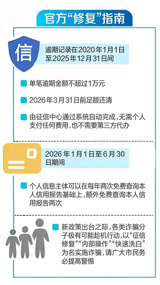 与此同时,也有机构招揽生意,声称可付费进行"信用修复"。专家提示,作为"经济身份证",个人征信 愈发受到重视,但要小心有人浑水摸鱼,"越帮越忙"。 来源:北京晚报微信公众号 近期,中国人民银行发布一次性信用修复政策,宣布自2026年元旦起,对特定历史时期的个人小额逾期 记录实施有条件、一次性的信用修复。不少率先行动的用户纷纷晒出"修复"完成、逾期记录清零的个人 信用报告。 声称:用法律知识"消除不良记录" 值得注意的是,央行此次发布的政策,并非长期的延续安排,而是面向特定群体,在一段时间内开放。 记者看到,其"修复"有着严格的制约条件——适用对象为个人在央行征信系统中展示的信贷逾期信息; 适用时间区间为2020年1月1日至2025年12月31日产生的逾期记录;适用金额为单笔逾期金额不超过1万 元;适用前提是逾期债务须在2026年3月31日前足额还清,四者缺一不可。 如果想要"修复"的逾期记录不在这个范围内,该怎么处置呢?记者发现,网络平台上还有不少号称能 够"消除不良记录"的信贷问题处理机构或个人,这些许诺靠谱吗? 以信用卡逾期为名,记者联系了多家机构,均需告知对方发卡银行、逾期次数和时间、金额等信息。一 家 ...