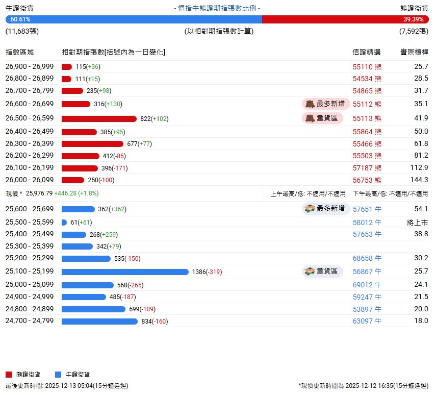 智通财经APP获悉,截至12月6日,恒指最新的牛熊街货比例为61:39。 中信证券牛熊证街货分布图中的数据显示,熊证街货重货区在26500-26599区间,该区间最新熊证数量为795张,较上一 交易日增加104张;熊证街货最多新增在26200-26299区间,该区间最新熊证数量为677张,较上一交易日增加248张。 牛证街货重货区在25100-25199区间,该区间最新牛证数量为1391张,较上一交易日减少125张;牛证街货最多新增在 25600-25699区间,该区间最新牛证数量为809张,较上一交易日增加233张。 | 牛證街貨 | | | - 恒指牛熊證期指張數比例 - | | | 熊證街貨 | | --- | --- | --- | --- | --- | --- | --- | | 60.93% | | | | | | 39.07% | | (11,549張) | | | (以相對期指張數計算) | | | (7,404張) | | 指數區域 | 相對期指張數[括號內為一日變化] | | | | 信證精選 | 雪陰楨桿 | | 27,000 - 27,099 | 372(-33) | | | | 5 ...