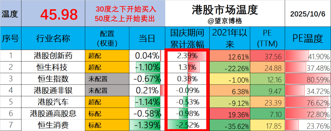 港股创新药低开高走,收盘竟然还涨了0.04%,国庆期间累计涨幅2.39%,没想到最坚挺的竟然是港股创新药。 恒生科技暴涨一天之后,已经连续两天回调了,国庆期间累计涨幅为1.31%,有点略显弱势了。 今天是中秋节,港股继续开盘。 节后黄金股与有色股势必大涨了,之前私域发车的资源基金(现在感觉)又买少了。 反倒是明天"中秋节翌日",港股休市。 | 温度 | 45.98 | 50度之上开始卖出 | 30度之下开始买入 | 港股市场温度 | | | 2025/10/6 | | --- | --- | --- | --- | --- | --- | --- | --- | | | | | | @望京博格 | | | | | 序号 | 行业名称 | 配置 | ポロ | 国庆期间 | 2021年以 | PE | PE温度 | | | | (权重) | | 累计涨幅 | 来 | (TTM) | | | | 港股创新药 | 超配 | 0.04% | 2.39% | 12.61% | 37.56 | 41.90% | | 2 | 恒生科技 | 超配 | -1.10% | 1.31% | -22.26% | 24.88 | 37. ...
