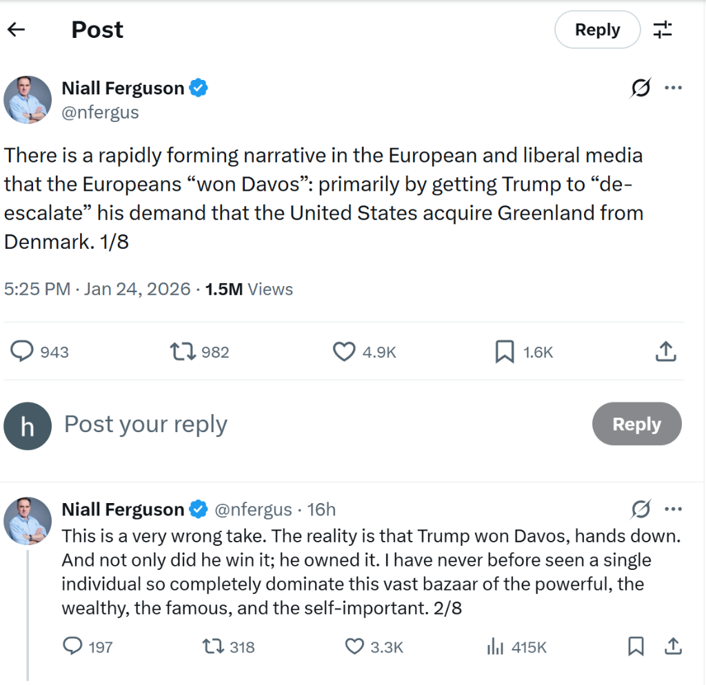 核心观点 - 知名历史学家尼尔·弗格森认为,特朗普在达沃斯论坛炒作“购买格陵兰岛”议题是一场精心策划的战略佯攻,旨在转移欧洲领导人注意力,为美国在伊朗和乌克兰问题上实施激进政策扫清障碍,并揭示华盛顿可能正在酝酿重大地缘政治变动,刻意边缘化欧洲的传统外交影响力 [1] 达沃斯论坛的舆论与策略 - 欧洲及自由媒体中迅速形成一种叙事,认为欧洲“赢得了达沃斯”,主要原因是让特朗普“降低”了要求美国从丹麦购买格陵兰岛的调门 [2] - 弗格森认为这是一种非常错误的解读,现实是特朗普轻松赢得了达沃斯,并且完全主导了这个汇聚了权贵、富豪、名人和自命不凡者的庞大盛会 [2] - 特朗普从未认真打算吞并格陵兰岛或对欧洲加征新关税,因为美国已经拥有进入该冰冻岛屿所需的所有军事准入权,且特朗普在Truth Social上说的话大约只有一半是认真的 [2] - 十年前,欧洲人犯的错误是既不认真对待特朗普,也不按字面理解他;现在他们则犯了相反的错误,既认真对待又按字面理解他 [2] 秘密外交与地缘政治行动 - 总统特使Steve Witkoff和Jared Kushner已离开达沃斯前往莫斯科与俄罗斯总统普京就乌克兰冲突进行会谈,随后将转往阿布扎比进行美、俄、乌三方会谈 [6] - Witkoff曾乐观表示,俄罗斯与乌克兰之间的和平谈判已“接近尾声”,目前仅剩一个关键议题待决 [6] - 这一系列动作表明,白宫倾向于绕过欧洲盟友处理关键的地缘政治危机 [6] - 若欧洲介入,势必会在伊朗问题上呼吁“局势降温”,并在乌克兰和平方案上提出异议,因此“格陵兰岛购岛风波”成为典型的特朗普式掩护,通过制造耸人听闻的头条新闻来掩盖真实战略意图,从而不受干扰地推进美国在中东和东欧的政策议程 [6] 军事部署与外交策略 - 特朗普政府在伊朗和乌克兰问题上采取“少说多做”的策略,军事部署动作明显升级 [7] - “亚伯拉罕·林肯”号航母及其打击群正在向波斯湾推进,核心任务是制定针对伊朗的一揽子打击方案,等待总统最终批准,表明美国对伊朗的强硬姿态已进入实质性军事准备阶段 [7] - 白宫高级特使正在进行高强度穿梭外交,显示美国试图在没有欧洲直接参与的情况下解决乌克兰危机的决心 [7] - Witkoff透露俄乌和平谈判的障碍已减少至“单一议题”,弗格森推测这一核心症结很可能是乌克兰向俄罗斯割让领土的问题 [7] 边缘化欧洲的战略考量 - 特朗普政府更愿意让欧洲人纠结于格陵兰岛话题,而非参与伊朗或乌克兰的实质性讨论,核心原因在于美欧在处理这两大危机上存在根本分歧 [8] - 在伊朗问题上,欧洲必将重申其一贯的“降温”立场,这与美国目前寻求军事施压的策略背道而驰 [8] - 在乌克兰问题上,美国方面认为欧洲和英国的外交官此前阻碍了和平进程,Witkoff和Kushner曾与俄罗斯代表制定了一份28点和平计划,但美方认为正是欧洲方面的坚持修改干扰了该计划的推进 [8] - 通过制造格陵兰岛这一荒诞且高调的话题,特朗普成功吸引了欧洲舆论和领导人的火力,从而为美国特使在莫斯科和阿布扎比的秘密谈判争取了不受干扰的空间 [8] 特朗普式战略佯攻的本质 - 弗格森将格陵兰岛事件定义为“特朗普式的掩护”,即通过制造干扰项来掩盖真实意图 [9] - 此策略与特朗普此前行为类似:就在美国对福尔多核设施发动空袭的前一天,特朗普还曾声称与伊朗的和平谈判正在继续 [9] - 这种战术的核心在于利用媒体和公众对头条新闻的追逐,混淆视听,使外界难以区分事实与猜想 [9] - 通过迫使格陵兰岛成为达沃斯论坛的头号话题,特朗普实际上实施了一次成功的战略欺骗,确保了美国在中东和东欧政策上的单边行动能力,规避了来自跨大西洋盟友的潜在阻力 [9]