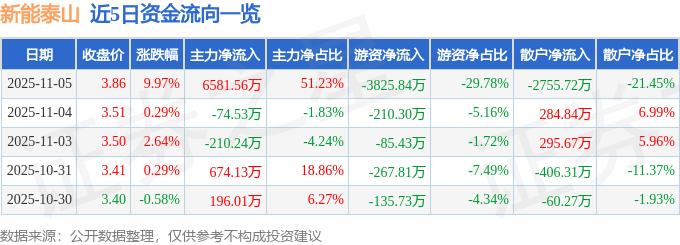 股价表现与资金流向 - 新能泰山于11月5日涨停收盘,收盘价为3.86元,当日涨跌幅为9.97% [1] - 该股在9点36分涨停,全天未打开涨停,收盘时封单资金为6322.23万元,占其流通市值的1.3% [1] - 当日主力资金净流入6581.56万元,占总成交额的51.23% [1] - 游资资金净流出3825.84万元,占总成交额的29.78%,散户资金净流出2755.72万元,占总成交额的21.45% [1] 公司基本面改善 - 公司前三季度营收同比增长30.38%,电缆业务销售显著增长 [1] - 归母净利润亏损同比收窄90.78% [1] - 经营性现金流由负转正,达到6.74亿元 [1] - 短期借款减少4.7亿元,债务结构得到优化 [1] - 公司近期完善了内幕信息管理和信息披露等制度,治理水平提升 [1] 行业与市场催化因素 - 微软CEO关于人工智能行业电力短缺的言论引发市场对电缆需求的关注 [1] - 公司具有央企背景,且属于电力体制改革、房地产、国企改革概念热股 [1] - 11月5日,电力体制改革概念板块上涨1.69%,房地产概念板块上涨0.95%,国企改革概念板块上涨0.78% [1] 近期资金流向趋势 - 在11月5日之前的四个交易日(10月30日至11月4日),主力资金流向波动较大,其中10月31日净流入674.13万元,占比18.86%,而11月3日和4日均为净流出 [1]