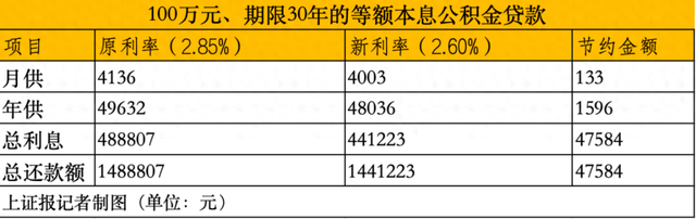 房贷族请注意!新年伊始,两份"减负礼包"已到账! 自2026年1月1日起,存量公积金贷款利率迎来下调,而部分商业性个人住房贷款也将迎来重定价日而实 现利率下调,每个月能省去不少月供。 无论是公积金贷款还是商业贷款,都无需个人申请,银行会自动调整。 减负利好一:存量公积金贷款利率下调 根据2025年5月7日发布的《中国人民银行关于下调个人住房公积金贷款利率的通知》,自2025年5月8日 起,下调个人住房公积金贷款利率0.25个百分点,5年以下(含5年)和5年以上首套个人住房公积金贷 款利率分别调整为2.1%和2.6%。5年以下(含5年)和5年以上第二套个人住房公积金贷款利率分别调整 为2.525%和3.075%。 对于2025年5月8日以前已经发放的个人住房公积金贷款,自2026年1月1日开始,执行调整后的个人住房 公积金贷款利率。 假如借款人购买首套房,以一笔100万元、期限30年的等额本息公积金贷款为例,本次利率下调将为存 量贷款人带来直接的减负效果。在原利率2.85%时,借款人每月需还款约4136元,年还款额约为49632 元。当利率降至2.60%后,其月供将减少至约4003元,年还款额相应降至约4803 ...