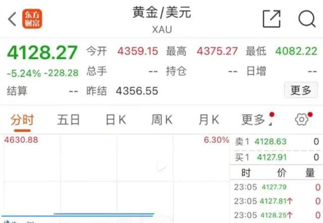 当地时间10月21日,国际黄金市场在此前连创纪录高位后急剧下挫。现货黄金一度暴跌超6%,创下自 2013年4月以来最大单日跌幅。 10月22日上午,记者走访了一家大型黄金珠宝消费市场。"以前也就5块、10块(每克)降,最多也就降 20多,这一下降了50。"一位商家告诉记者,在她从业生涯中还从没见到过这么大的单日跌幅。部分分 析人士认为,这一轮下跌更多是技术性调整,而非趋势性逆转。 | < 38 | 黄金/美元 | | O | | --- | --- | --- | --- | | | XAU | | | | | 4128.27 今开 4359.15 最高 4375.27 最低 4082.22 | | | | -5 24% -228 28 芯手 -- 2 | -- 持仓 -- 日增 | | | | 铝复 | -- 昨结 4356.55 | | 重号 | | 分时 | 月K 更多, ◎ 五日 日K 周K | | | | 4630.88 | | 6.30% 卖1 4128.63 | 0 | | | | 买1 4127.91 | 0 | | | | 时 价 | 量 | | | | 23:05 4127.79 | 0 ...