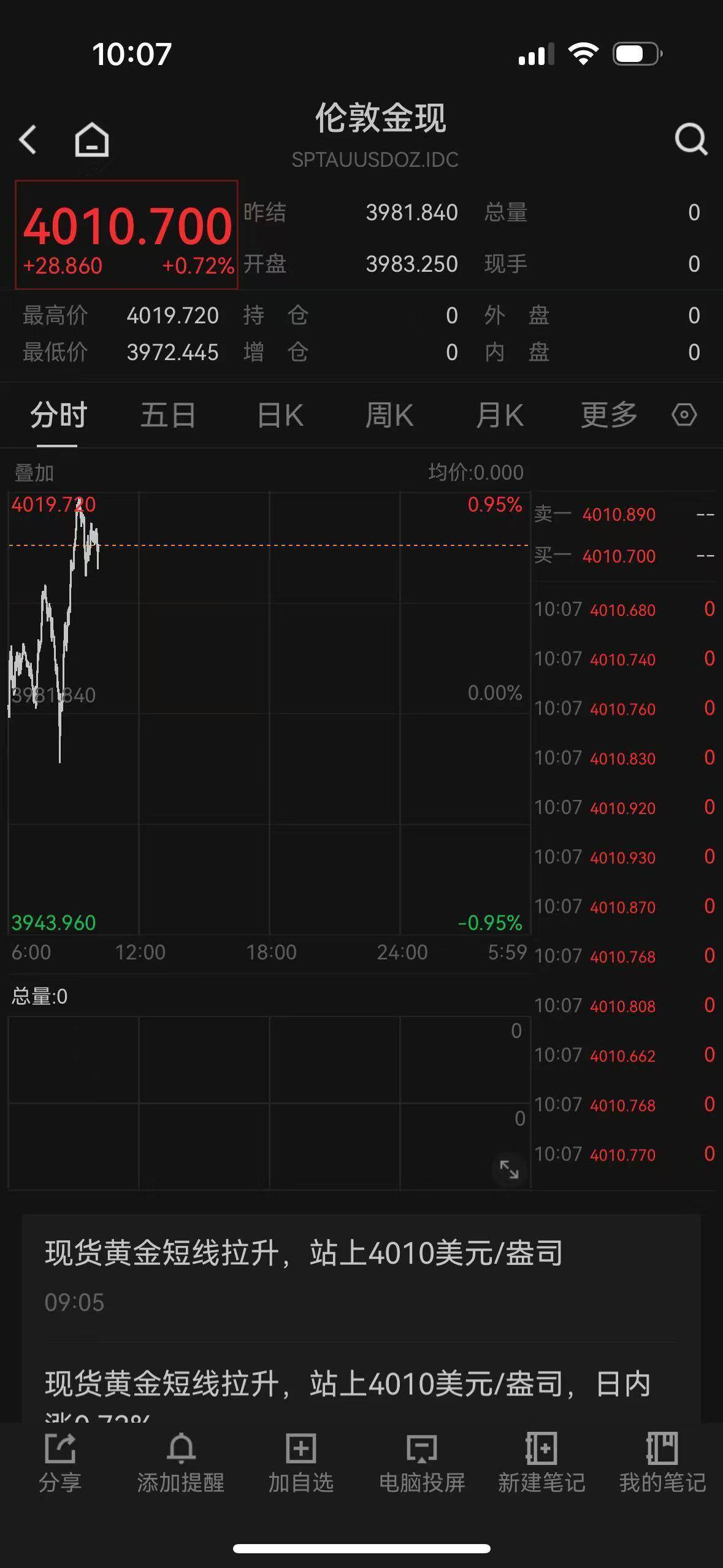潮新闻客户端 记者 吴恩慧 "黄金怎么了?我上周刚买就被套牢!"杭州的彭女士在上周刚刚在手机银行购入了10克如意积存金,当时是每克956元,没想到,今天早上打开手机一看, 已跌至928元/克。 飙涨的贵金属在上周闪崩之后,昨夜再次大跌!WIND数据显示,10月27日,伦敦现货黄金大跌3.15%,跌破4000美元/盎司,收于3981.84美元/盎司,伦敦 现货白银同样大跌3.4%,收于46.968美元/盎司。 | 3943.960 | | | | -0.95% | 10:07 4010.870 | | --- | --- | --- | --- | --- | --- | | 6:00 | 12:00 | 18:00 | 24:00 | | 5:59 10:07 4010.768 | | 总量:0 | | | | | 10:07 4010.808 | | | | | | 0 | | | | | | | | 10:07 4010.662 | | | | | | | 10:07 4010.768 | | | | | | 0 | | | | | | | | 10:07 4010.770 | | | | | | 12 ...