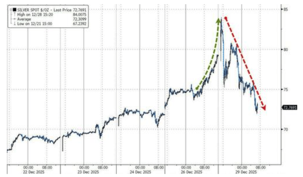 白银价格在首次突破每盎司80美元大关后遭遇急剧回落,终结了近期近乎垂直的上涨行情。尽管市场经历了剧烈波动,但交易员难以找到引发此 次暴跌的单一明确催化剂,极端的市场情绪正面临修正。 投机热潮与监管刹车 周一隔夜市场,白银价格一度冲高至84美元上方,随后大幅跳水,早期涨幅几乎回吐殆尽,最终仅收涨0.51%。与此同时,贵金属板块集体承 压,铂金和钯金双双跌停,黄金亦下跌0.91%,四种主要贵金属合约的持仓量均出现下降。 此次行情逆转发生在中国投资需求激增的背景下。上海现货白银较伦敦价格的溢价一度超过8美元,创下历史新高。面对疯狂的市场情绪,中国唯 一的纯白银基金在多次发布风险提示无效后,不得不采取拒绝新客户的极端措施。 针对此次回调,高盛亚洲交易台指出,市场并无"确凿的做空理由"。分析人士普遍认为,假期期间流动性稀缺、交易所提高保证金要求以及技术 指标显示的极端的超买信号,共同促成了此次价格的剧烈修正。 缺乏明确的做空理由 尽管市场波动剧烈,但机构对于具体的下跌动因看法谨慎。 高盛亚洲交易台指出,虽然距离新年仅剩三天,中国大宗商品市场依然波动剧烈。白银在午盘休息前一度飙升9.25%,但随后在没有明显利空消 息的情 ...