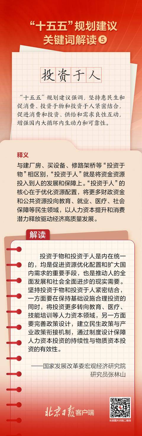 近日出版发行的《党的二十届四中全会〈建议〉学习辅导百问》,对"怎样理解投资于物和投资于人紧 密结合?"作出回答。 同时要看到,我国人均资本存量水平相较于发达国家还比较低,存量资本结构还有待进一步优化提升, 一些重要产业领域投资不足、投资质量有待提升,一些关键核心技术受制于人,不少存量机器设备、基 础设施、老旧小区、城区等有待更新升级,新一轮科技革命和产业变革也推动大量新的投资需求快速涌 现,我国投资于物仍有很大空间潜力。 第二,"十五五"乃至更长时期投资于人的重要性和紧迫性日益凸显。投资于人是指对全人群、全生命周 期人的能力提升和潜力开发的投入,比如育幼、养老、健康、教育、技能培训等。我国经济长期依靠要 素驱动、投资拉动,投资于物回报率近年来已经有所下降。在全球产业竞争已从"资本密集"转向"人才 密集"大趋势下,要推动我国经济增长动力机制转换,实现创新驱动、需求拉动,亟须加大对人的投 资,推动人力资本积累,形成"人力资本红利"。只有这样,才能构筑经济长期发展竞争力,才能在新一 轮科技革命和产业变革中赢得战略主动。此外,相较于物质资本投入而言,我国一直以来对民生和人的 全面发展相关领域投入不足,加大对教育、医疗 ...