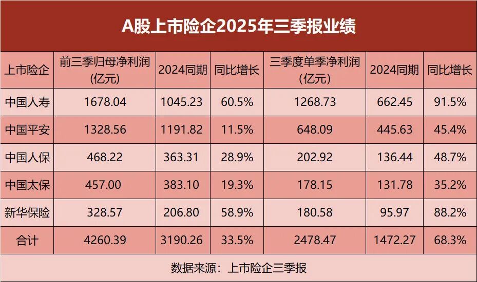 上市险企盈利再破记录! 2025年前三季度,中国人寿、中国平安、中国人保、中国太保、新华保险等五大A股上市险企合计实现归母净利润 4260.39亿元,较去年同期增加超千亿元,增幅33.5%,继去年同期创下历史新高后再上新台阶。 仅从第三季度表现来看,数据更是惊人,五大上市险企单季度净利润同比增长达68.3%。 前三季盈利已超去年全年 这个财报季,上市险企的数据相当闪亮。据A股上市险企三季报,多家险企前三季度盈利创历史最高。其中,第三季 度净利润大增。 其中,中国人寿前三季度归母净利润1678.04亿元,同比增长60.5%;新华保险前三季度归母净利润328.57亿元,同比 增长58.9%;中国人保前三季度归母净利润468.22亿元,同比增长28.9%;中国太保前三季度归母净利润457亿元,同 比增长19.3%;中国平安前三季度归母净利润1328.56亿元,同比增长11.5%。 如果将目光聚焦到第三季度,增长态势将更为直观。 三季报显示,中国人寿第三季度单季归母净利润达1268.73亿元,同比增长达91.5%;新华保险第三季度归母净利润 180.58亿元,同比增长88.2%;中国平安第三季度归母净利润648.09 ...