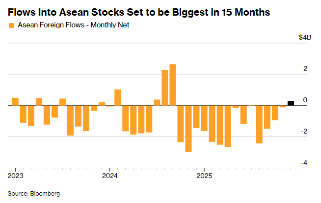全球资本重返东南亚股市概况 - 全球资本于本月正重返东南亚股市 使该地区成为2026年全球金融版图中不可忽视的关键板块 [1] - 12月东南亚新兴市场已吸引外资净流入3.37亿美元 这一规模有望创下2024年9月以来的新高 [1] - 此前11个月里 外资有10个月在抛售东南亚区域股票 而当前印尼和泰国市场正引领资本回流浪潮 [1] - 从全年来看 2025年东南亚股市外资净流出规模仍高达约150亿美元 [1] 市场表现与驱动因素 - 2025年 MSCI东盟指数跑输更广泛的亚太指数约13个百分点 创下五年来最大差距 [1] - 核心原因之一在于该区域缺乏与蓬勃发展的人工智能(AI)产业相关的标的资产 [1] - 除估值洼地的吸引力外 在市场担忧AI泡沫膨胀的背景下 众多基金经理急于为高仓位的科技股寻找替代配置 东盟市场也因此成为优选标的 [1] - 投资者普遍存在分散配置的需求 希望降低对美国市场及AI等拥挤赛道的依赖 东盟市场将从中直接受益 [1] - 东盟各市场背后有着截然不同的增长驱动引擎 [1] 具体国家市场的利好因素 - 越南等东盟市场被认为将从全球供应链转移以及美联储预期降息中获益 [2] - 富时罗素已于10月宣布将越南股市升级至次级新兴市场地位 这也将为其股市带来利好 [2] - 印尼 越南 菲律宾等国的股市盈利前景正逐步改善 [2] - 利好因素包括各国政府推出大规模财政支出计划 着力加强基础设施建设并提振居民消费需求 同时部分国家还具备宽松货币政策的支撑环境 [2] 估值水平分析 - 印尼 泰国 马来西亚和越南的基准股指当前动态市盈率处于12至15倍区间 [2] - 菲律宾基准股指市盈率更是低于10倍 [2] - 相比之下 标普500指数的市盈率已超过22倍 [2] 市场面临的潜在风险 - 作为东南亚两大经济体 泰国和印尼均因国内政局动荡而承压 [4] - 泰国总理阿努廷.参威拉军本月初宣布解散国会 并定于明年2月8日举行大选 [4] - 印尼方面 投资者则对总统普拉博沃苏比安托推行的民粹主义政策持谨慎态度 [4] - 若AI投资热潮持续获得市场追捧 东盟市场恐难以扭转当前的跑输局面 [5] 机构观点与资金流向预测 - 温和的估值水平正让东盟市场对价值型投资者的吸引力逐步提升 尤其是在盈利增长出现反弹的情况下 [5] - 从12月的资金流向数据来看 这一判断已得到验证 [5] - 若外资持仓比例回升至过去三年的中位水平 东南亚市场整体有望迎来高达200亿美元的潜在资金净流入 [5]